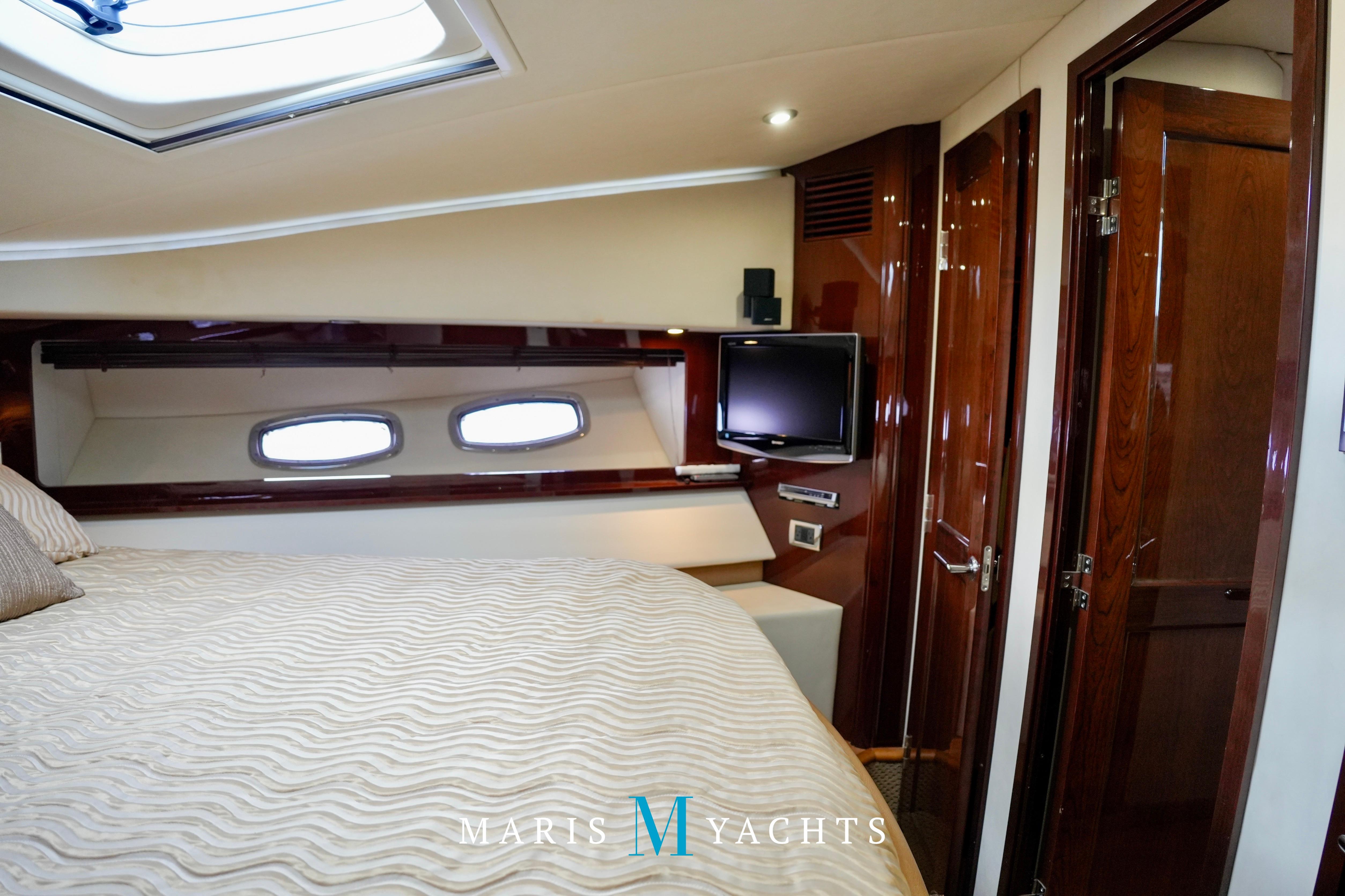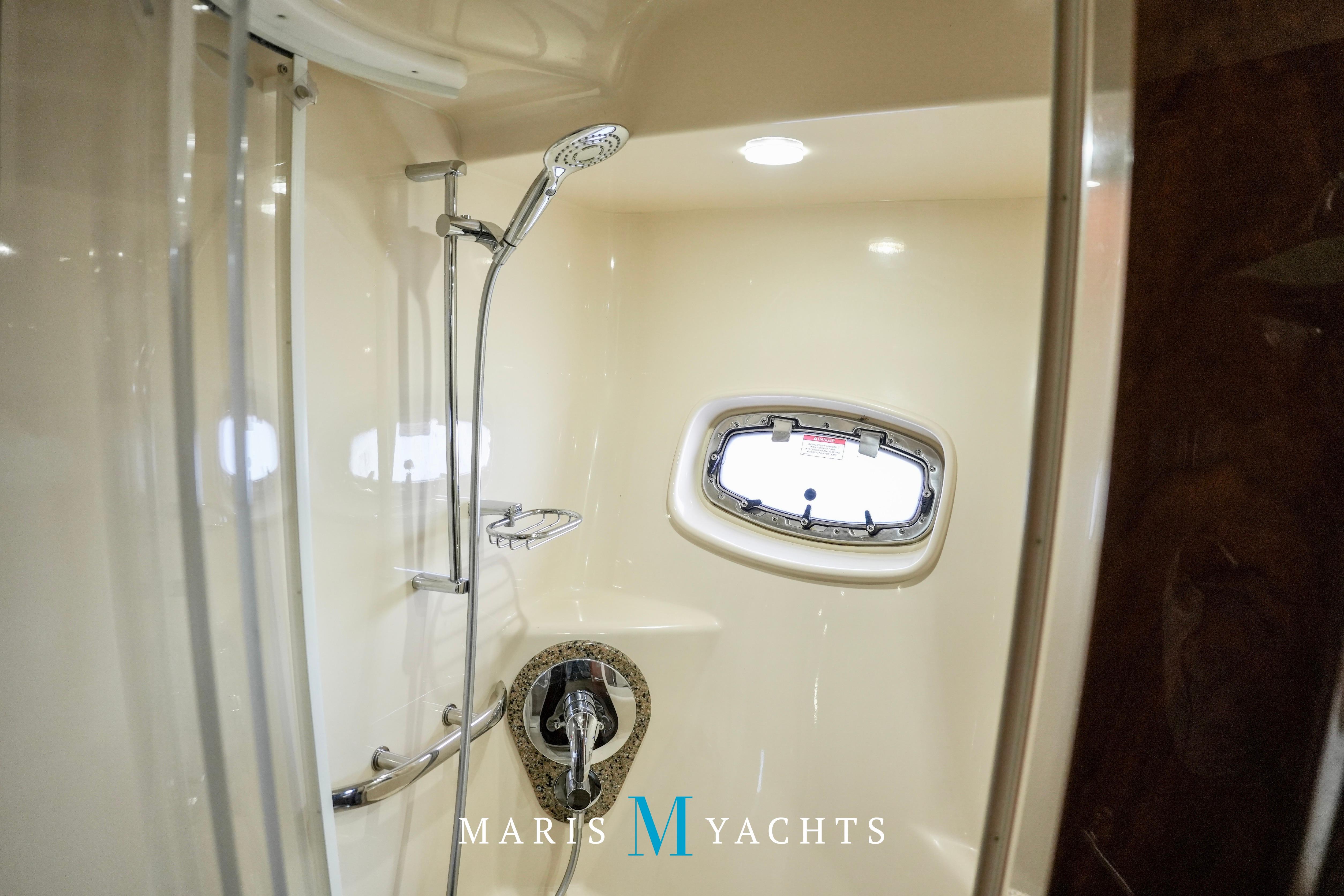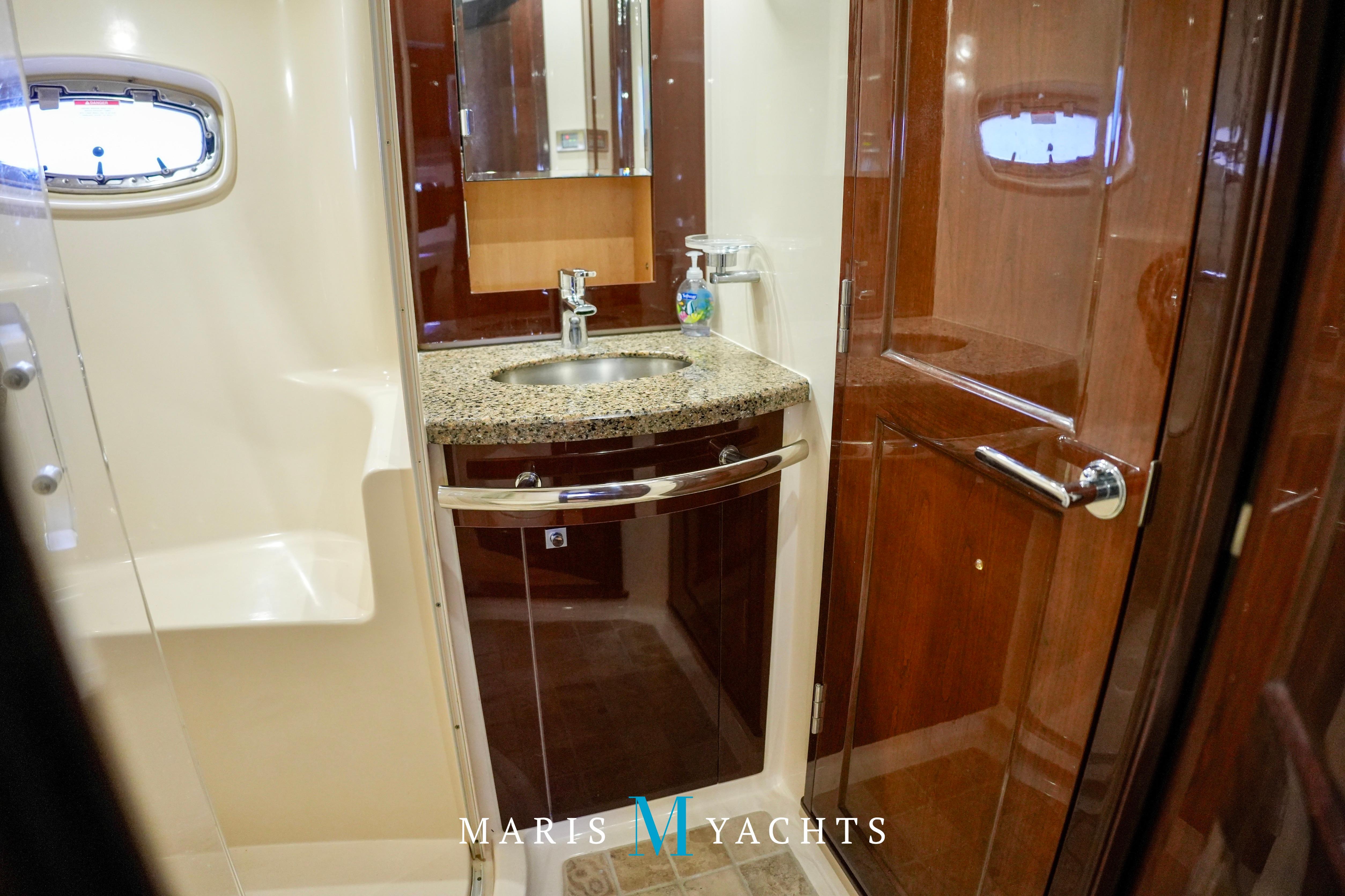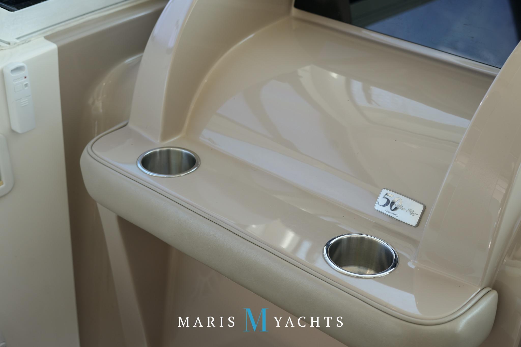 The 2009 Sea Ray 55 Sundancer, which became rebranded in 2010 as the 580 Sundancer, is a luxurious and impeccably designed yacht that offers unparalleled comfort and functionality. With its two-stateroom layout and expansive cockpit, the 55 Sundancer is the ultimate boat for entertaining and relaxing in style.This vessel underwent a significant upgrade in 2022 with the installation of two new FPT Marine engines, now with only 114 hours and 825HP each, in lieu of the 765HP MANN 800CR engines previously installed. She also is powered by a 21.5 Onan generator. The exterior of “Man O War” features a hydraulic swim platform, teak flooring in the upper cockpit, JL audio speakers, and a Fusion sound system. The large aft bench seating area includes a high-gloss table with two removable chairs, while the midship customizable carousel seating in the cockpit enhances versatility – providing the perfect space for social gatherings. The cockpit also has a fully equipped wet bar complete with sink, ice maker, fridge, electric grill and a mounted flat screen TV. The helm station is designed for ease of navigation and comfort, featuring fully adjustable dual captain’s seats with excellent visibility and a double-wide companion seat on the port side. The hardtop is enclosed and includes two independent retractable sunroofs and power side windows, offering both protection from the elements and a connection to the open air.The helm is equipped with dual Raymarine Hybrid Touch screen GS series color displays with GPS, plotter, radar and autopilot with a smart controller. Bow and stern thrusters ensure effortless maneuvering in any docking situation. Below deck, the cabin has rich dark cherry cabinetry with ample storage, a pop-up flat-screen TV and an L-shaped Ultraleather settee with a slide out that converts this into a double bed, allowing 6 adults to comfortably sleep on board. The U-shaped galley is both stylish and functional, featuring a hidden microwave oven, a three-burner electric stove, a refrigerator, a freezer, a sink and ample storage space. The forward VIP stateroom offers a queen-sized island-style bed, a large closet, and private access to the day head, ensuring comfort and convenience for guests. The full-beam master stateroom, located midship, features a queen-sized island-style actuating bed with massage function, a full dresser, ample storage, a mounted flat-screen TV and access to the full ensuite head Featuring
