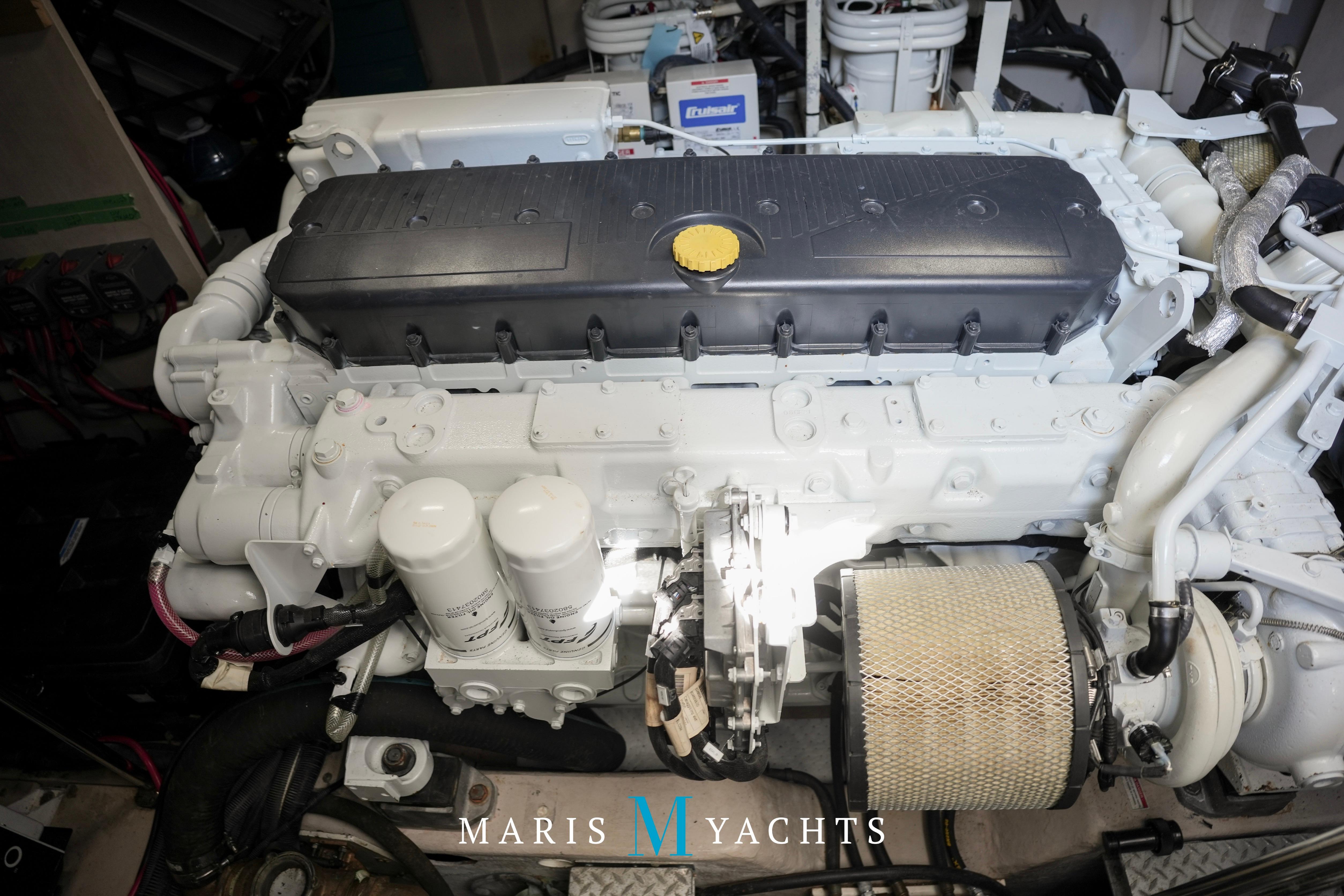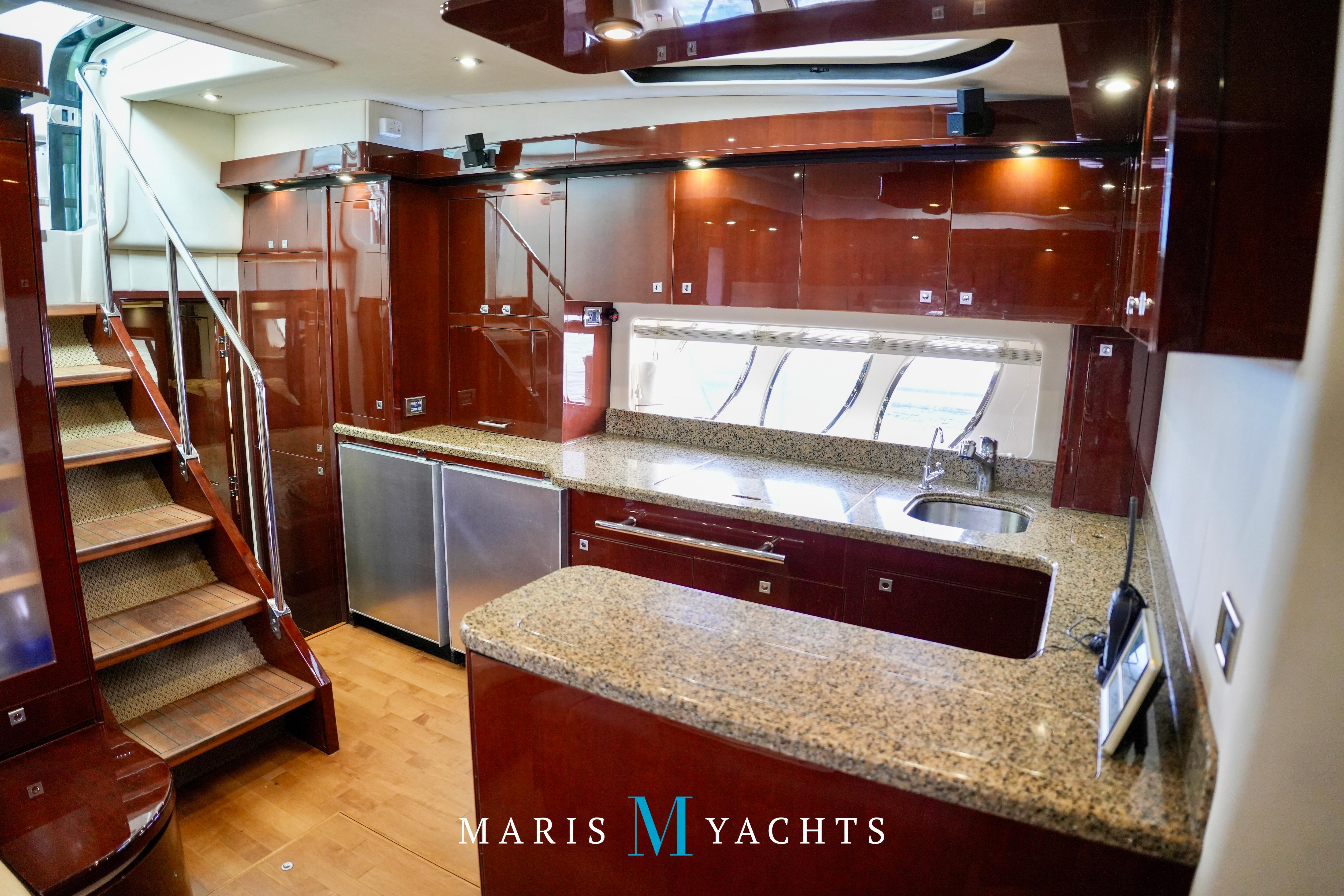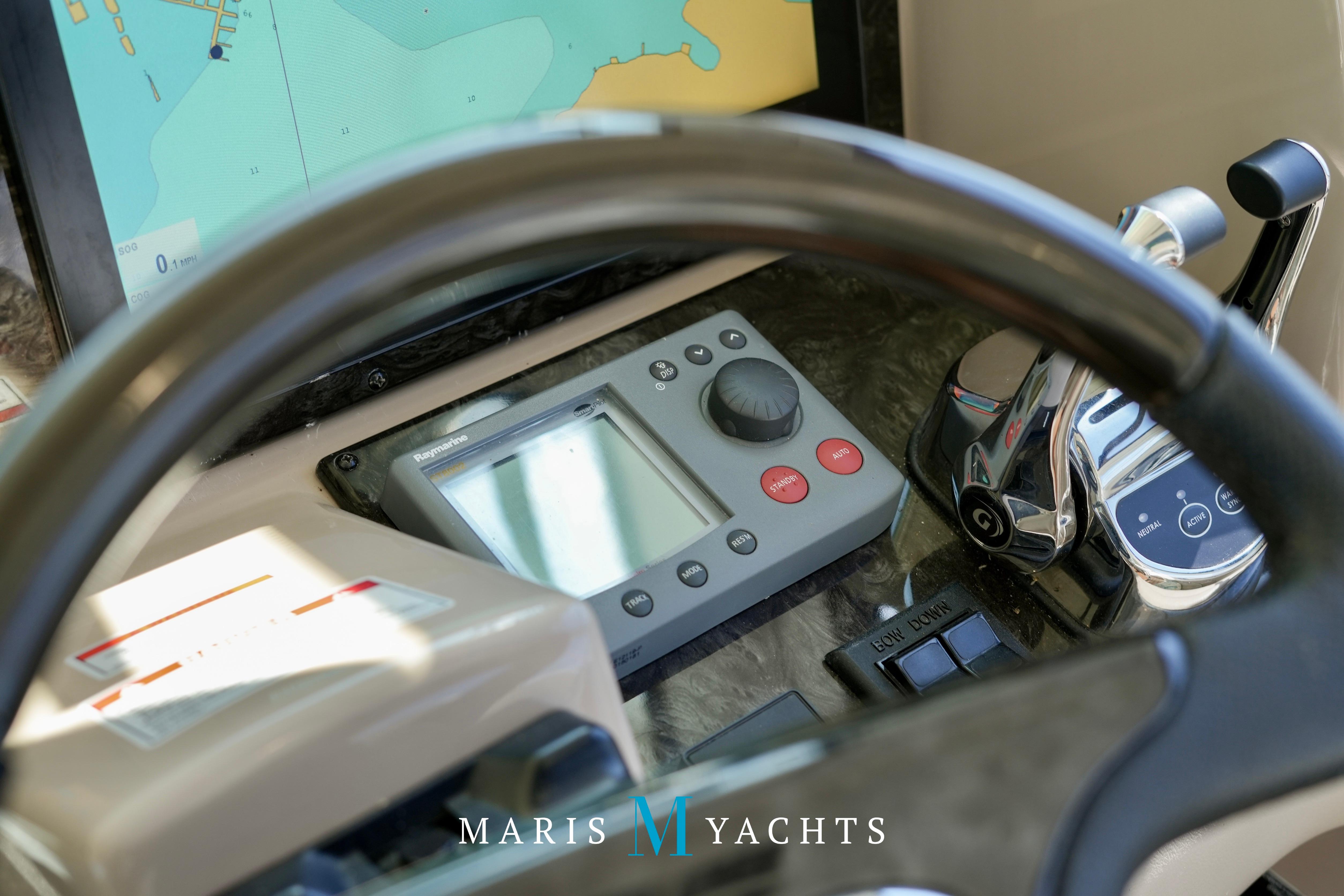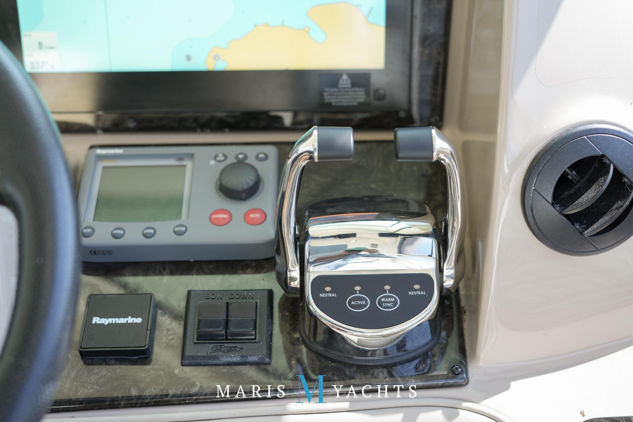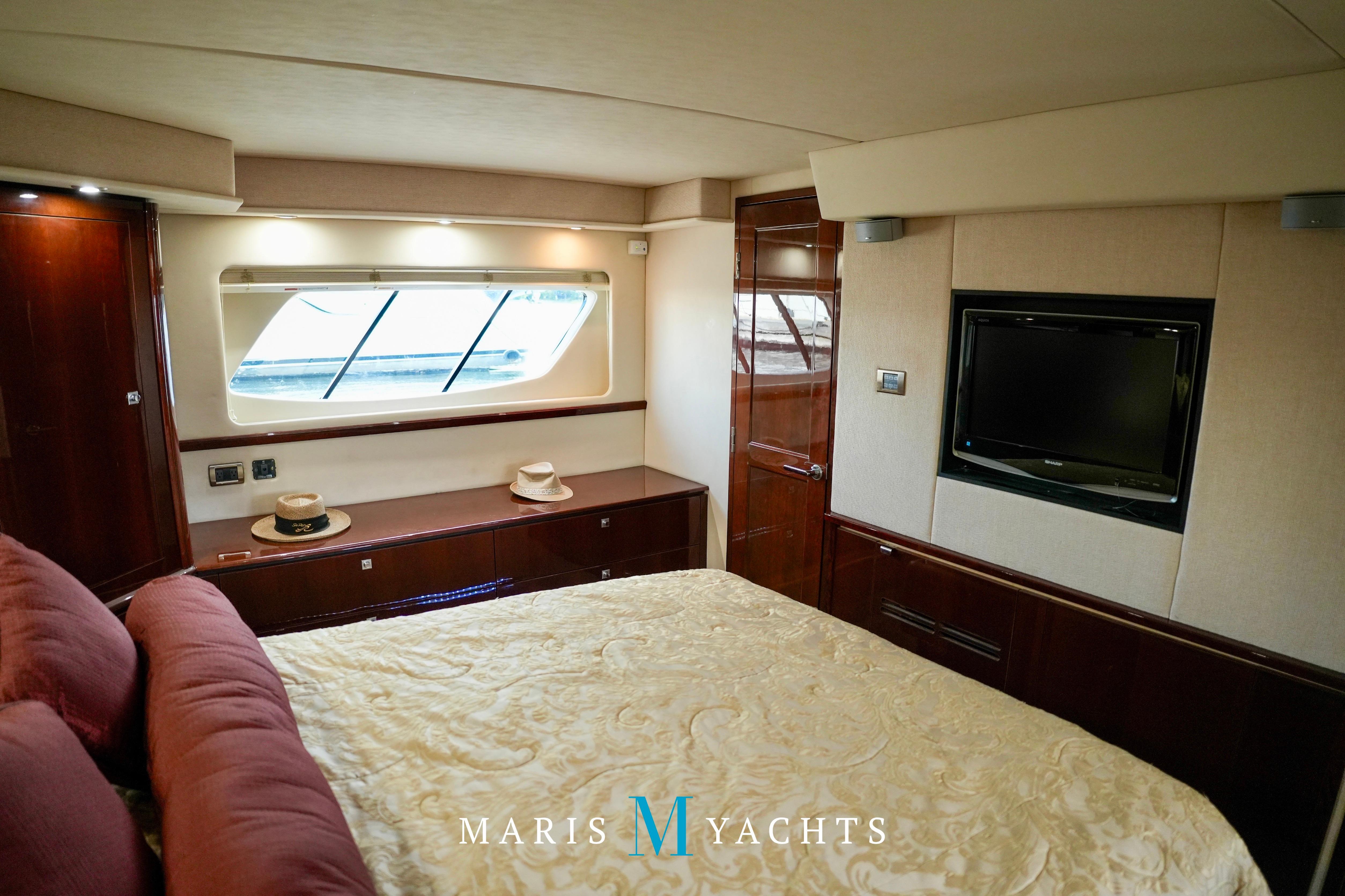 The 2009 Sea Ray 55 Sundancer, which became rebranded in 2010 as the 580 Sundancer, is a luxurious and impeccably designed yacht that offers unparalleled comfort and functionality. With its two-stateroom layout and expansive cockpit, the 55 Sundancer is the ultimate boat for entertaining and relaxing in style.This vessel underwent a significant upgrade in 2022 with the installation of two new FPT Marine engines, now with only 114 hours and 825HP each, in lieu of the 765HP MANN 800CR engines previously installed. She also is powered by a 21.5 Onan generator. The exterior of “Man O War” features a hydraulic swim platform, teak flooring in the upper cockpit, JL audio speakers, and a Fusion sound system. The large aft bench seating area includes a high-gloss table with two removable chairs, while the midship customizable carousel seating in the cockpit enhances versatility – providing the perfect space for social gatherings. The cockpit also has a fully equipped wet bar complete with sink, ice maker, fridge, electric grill and a mounted flat screen TV. The helm station is designed for ease of navigation and comfort, featuring fully adjustable dual captain’s seats with excellent visibility and a double-wide companion seat on the port side. The hardtop is enclosed and includes two independent retractable sunroofs and power side windows, offering both protection from the elements and a connection to the open air.The helm is equipped with dual Raymarine Hybrid Touch screen GS series color displays with GPS, plotter, radar and autopilot with a smart controller. Bow and stern thrusters ensure effortless maneuvering in any docking situation. Below deck, the cabin has rich dark cherry cabinetry with ample storage, a pop-up flat-screen TV and an L-shaped Ultraleather settee with a slide out that converts this into a double bed, allowing 6 adults to comfortably sleep on board. The U-shaped galley is both stylish and functional, featuring a hidden microwave oven, a three-burner electric stove, a refrigerator, a freezer, a sink and ample storage space. The forward VIP stateroom offers a queen-sized island-style bed, a large closet, and private access to the day head, ensuring comfort and convenience for guests. The full-beam master stateroom, located midship, features a queen-sized island-style actuating bed with massage function, a full dresser, ample storage, a mounted flat-screen TV and access to the full ensuite head Featuring