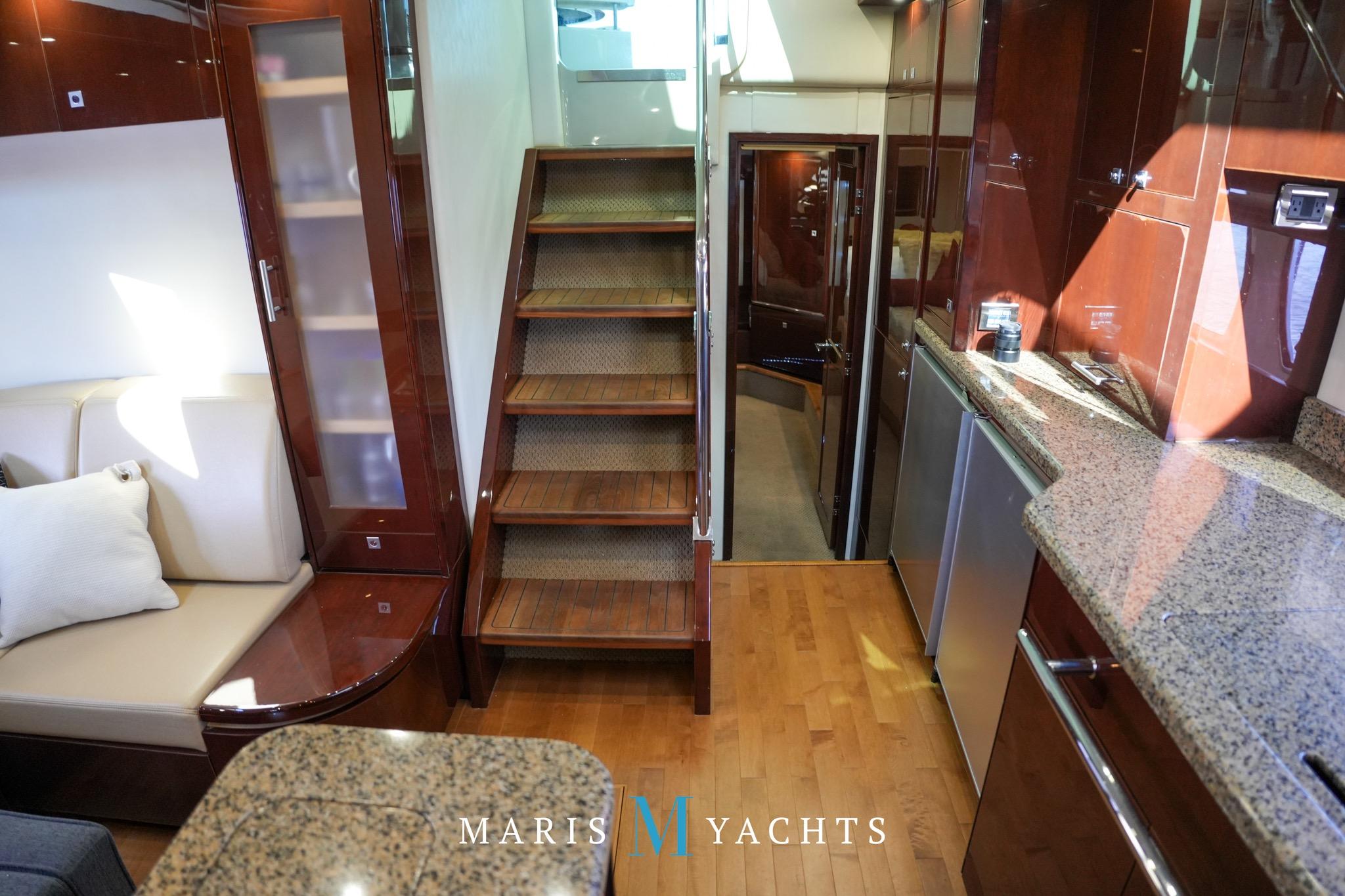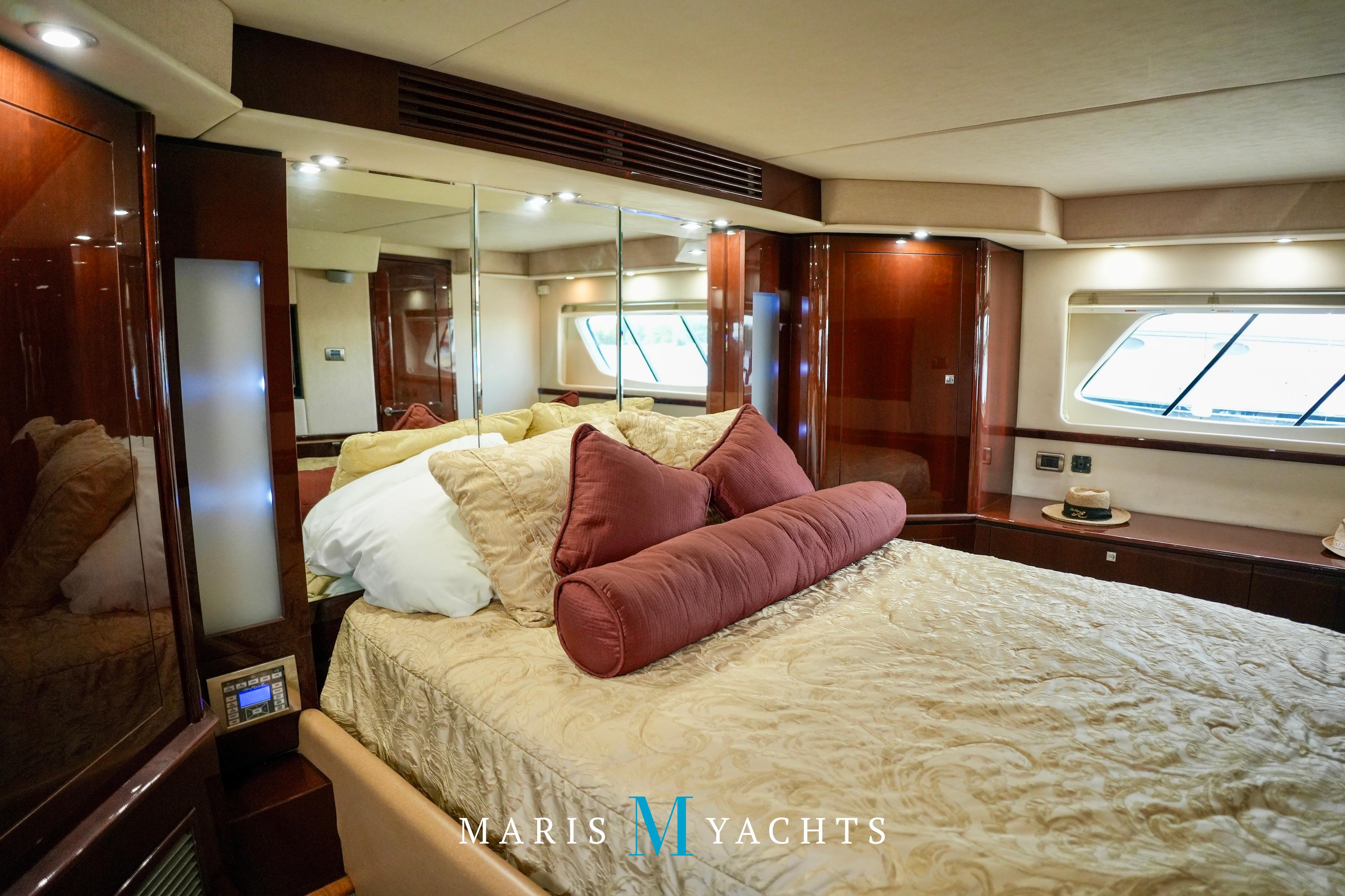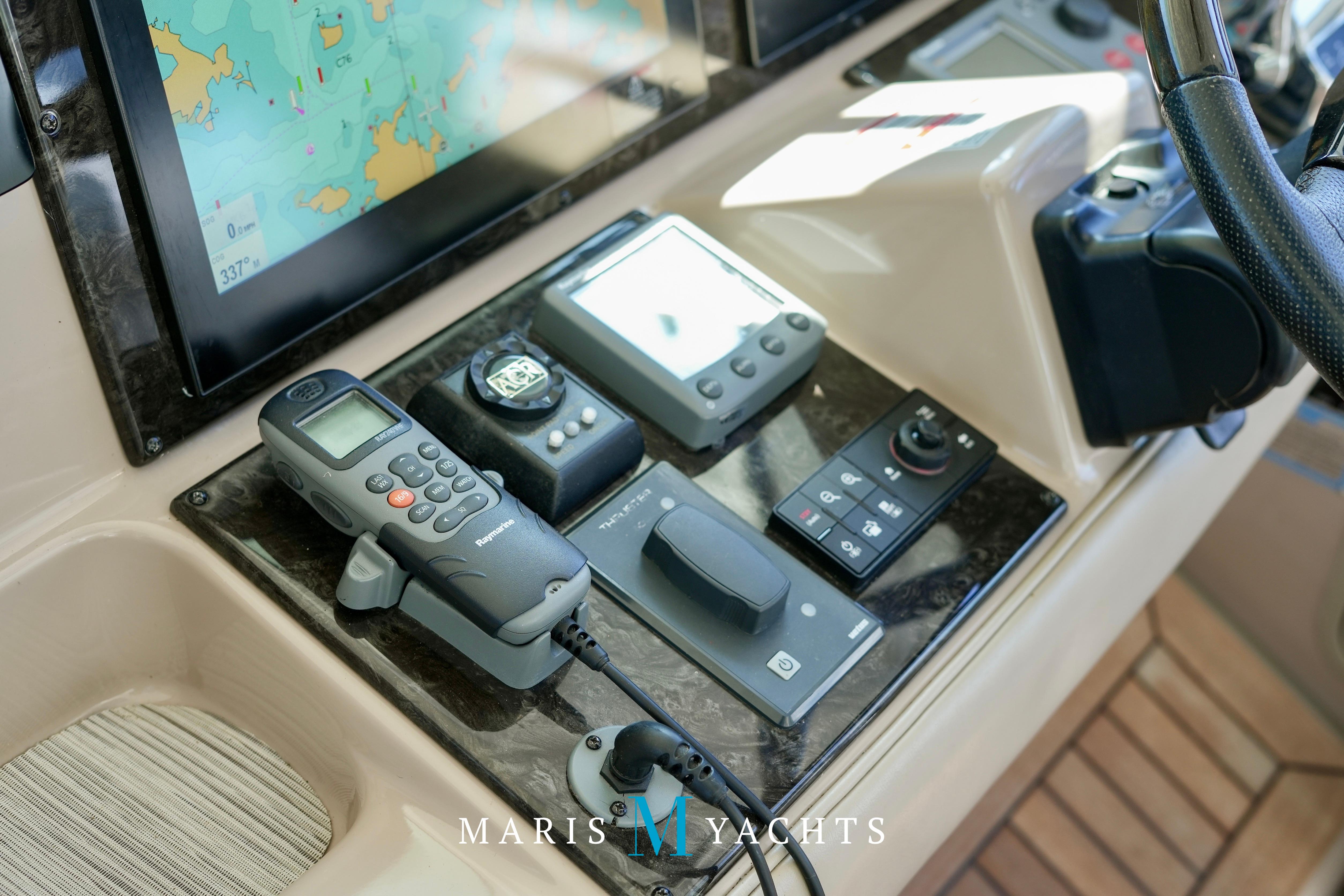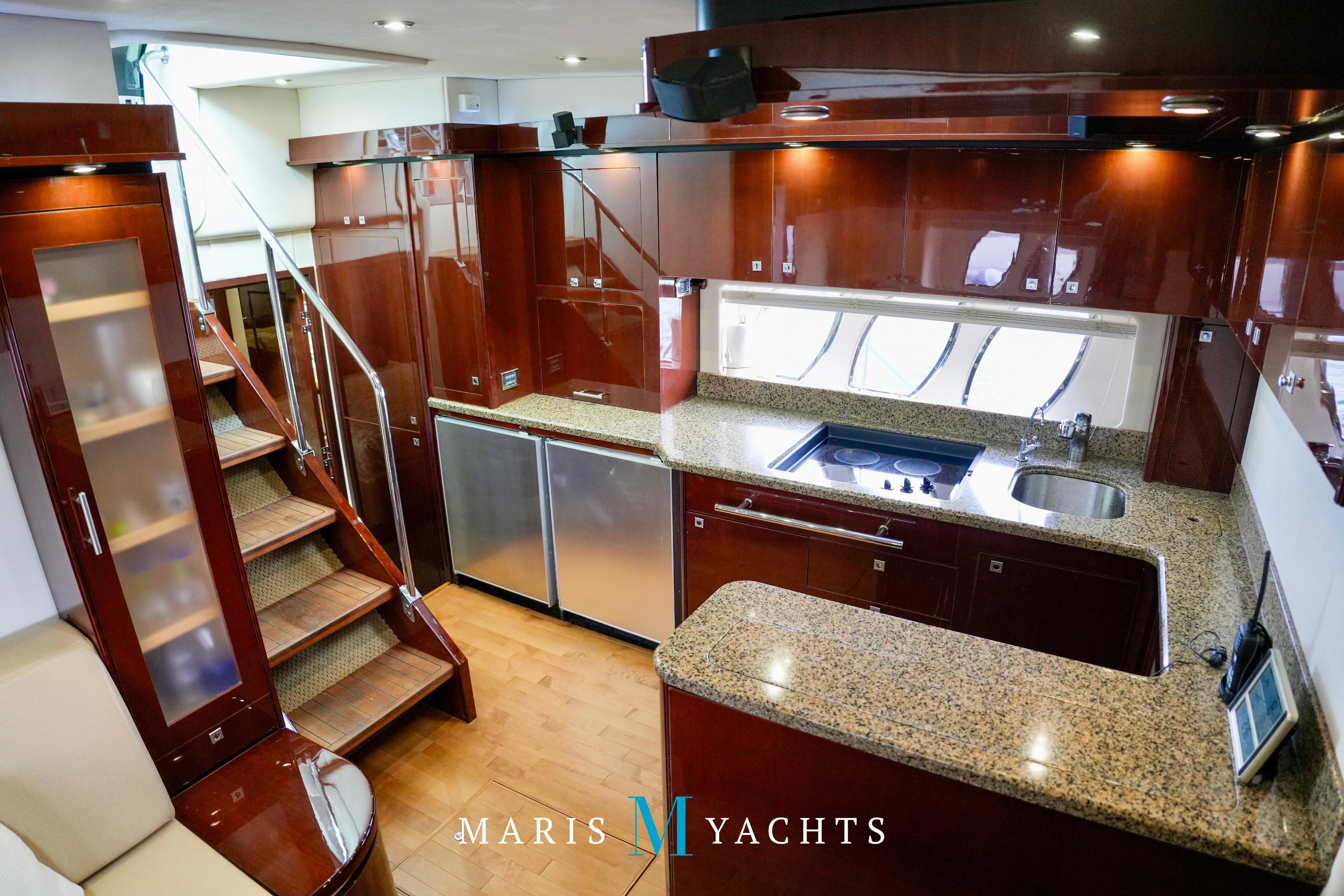 The 2009 Sea Ray 55 Sundancer, which became rebranded in 2010 as the 580 Sundancer, is a luxurious and impeccably designed yacht that offers unparalleled comfort and functionality. With its two-stateroom layout and expansive cockpit, the 55 Sundancer is the ultimate boat for entertaining and relaxing in style.This vessel underwent a significant upgrade in 2022 with the installation of two new FPT Marine engines, now with only 114 hours and 825HP each, in lieu of the 765HP MANN 800CR engines previously installed. She also is powered by a 21.5 Onan generator. The exterior of “Man O War” features a hydraulic swim platform, teak flooring in the upper cockpit, JL audio speakers, and a Fusion sound system. The large aft bench seating area includes a high-gloss table with two removable chairs, while the midship customizable carousel seating in the cockpit enhances versatility – providing the perfect space for social gatherings. The cockpit also has a fully equipped wet bar complete with sink, ice maker, fridge, electric grill and a mounted flat screen TV. The helm station is designed for ease of navigation and comfort, featuring fully adjustable dual captain’s seats with excellent visibility and a double-wide companion seat on the port side. The hardtop is enclosed and includes two independent retractable sunroofs and power side windows, offering both protection from the elements and a connection to the open air.The helm is equipped with dual Raymarine Hybrid Touch screen GS series color displays with GPS, plotter, radar and autopilot with a smart controller. Bow and stern thrusters ensure effortless maneuvering in any docking situation. Below deck, the cabin has rich dark cherry cabinetry with ample storage, a pop-up flat-screen TV and an L-shaped Ultraleather settee with a slide out that converts this into a double bed, allowing 6 adults to comfortably sleep on board. The U-shaped galley is both stylish and functional, featuring a hidden microwave oven, a three-burner electric stove, a refrigerator, a freezer, a sink and ample storage space. The forward VIP stateroom offers a queen-sized island-style bed, a large closet, and private access to the day head, ensuring comfort and convenience for guests. The full-beam master stateroom, located midship, features a queen-sized island-style actuating bed with massage function, a full dresser, ample storage, a mounted flat-screen TV and access to the full ensuite head Featuring
