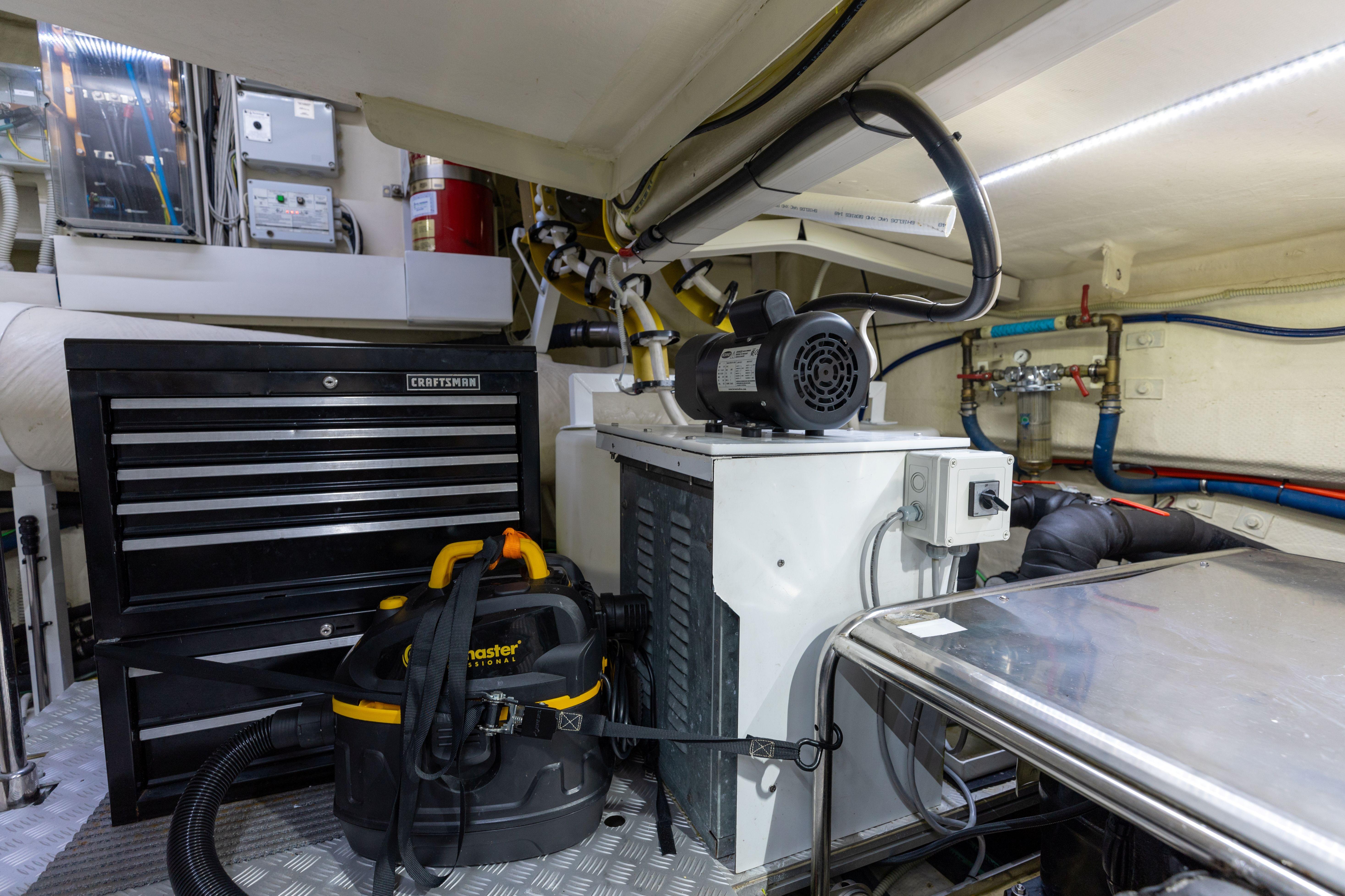 Fixed Brownies dive compressorĀ in the engine room with transom quick-connects.