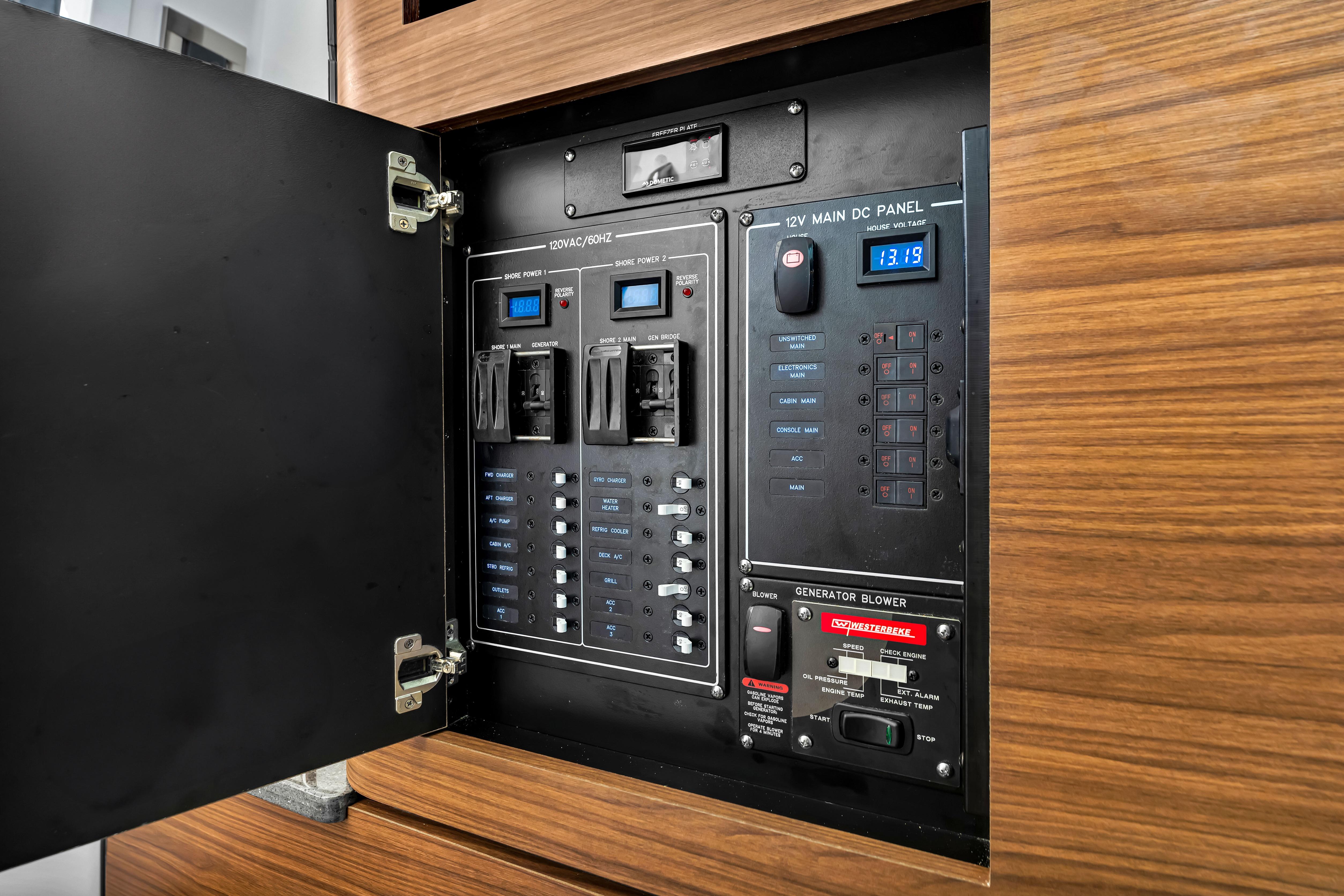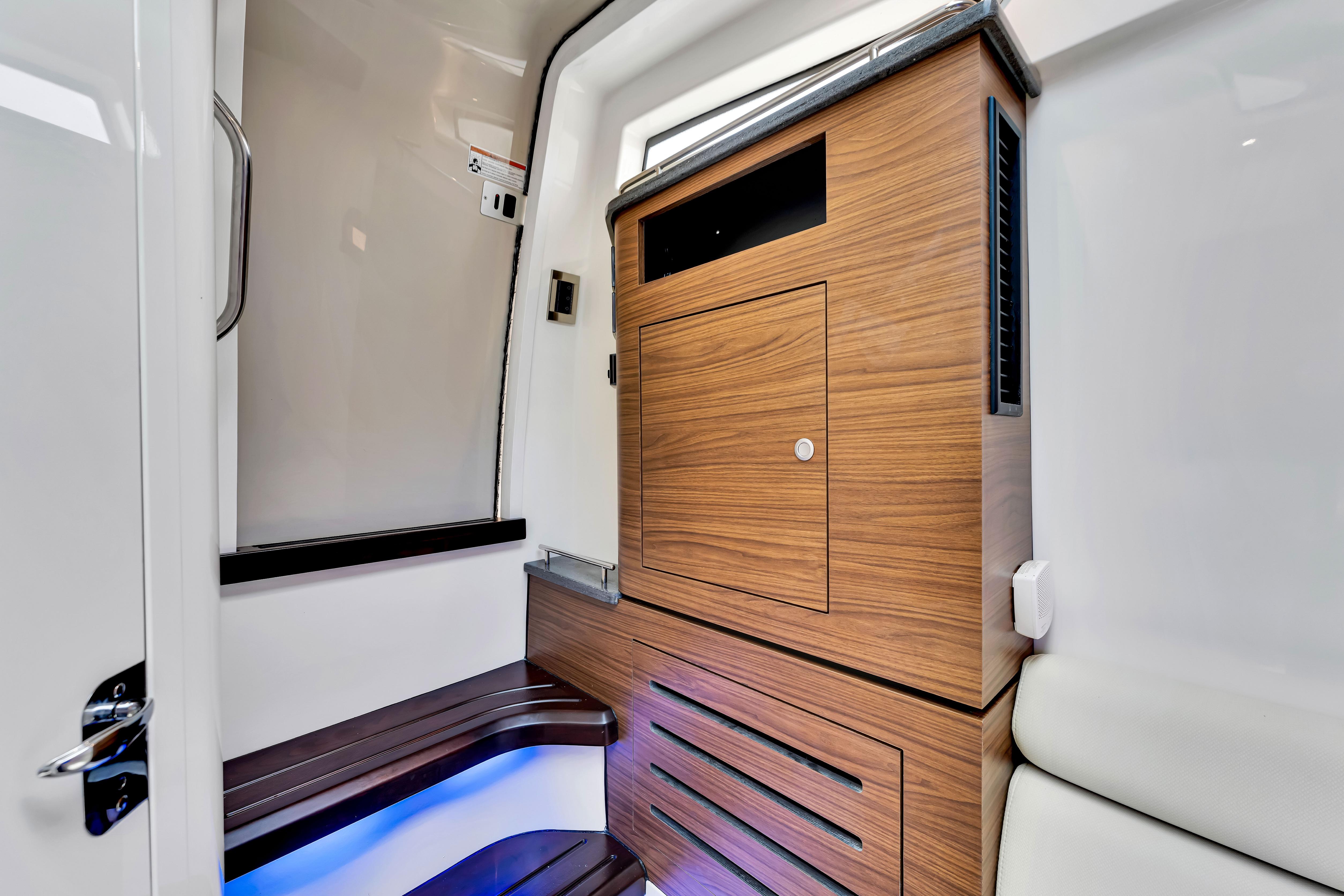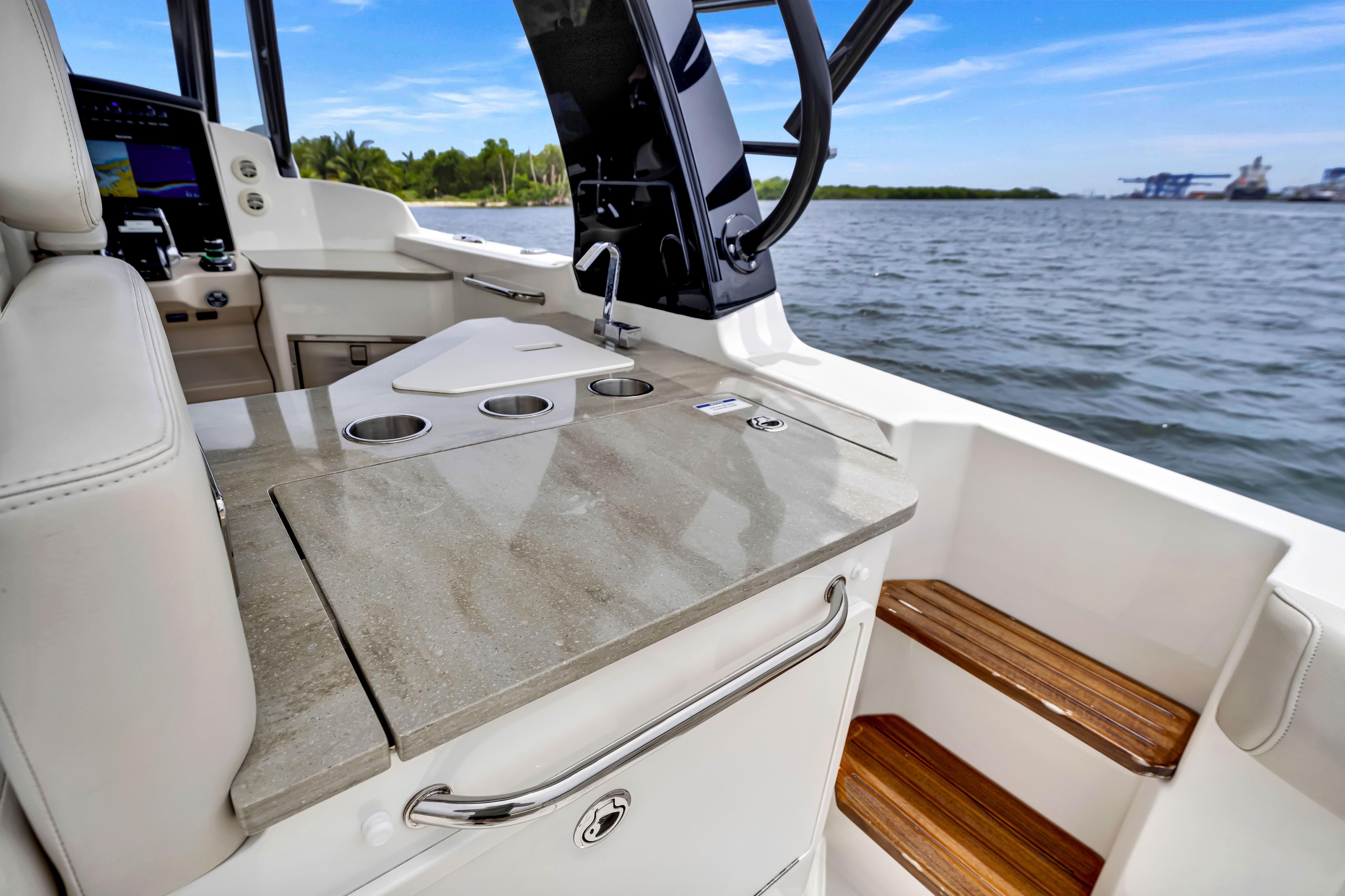 Entertaining-friendly Cockpit Prep Center features a refrigerator, hot & cold freshwater sink, electric grill and more.