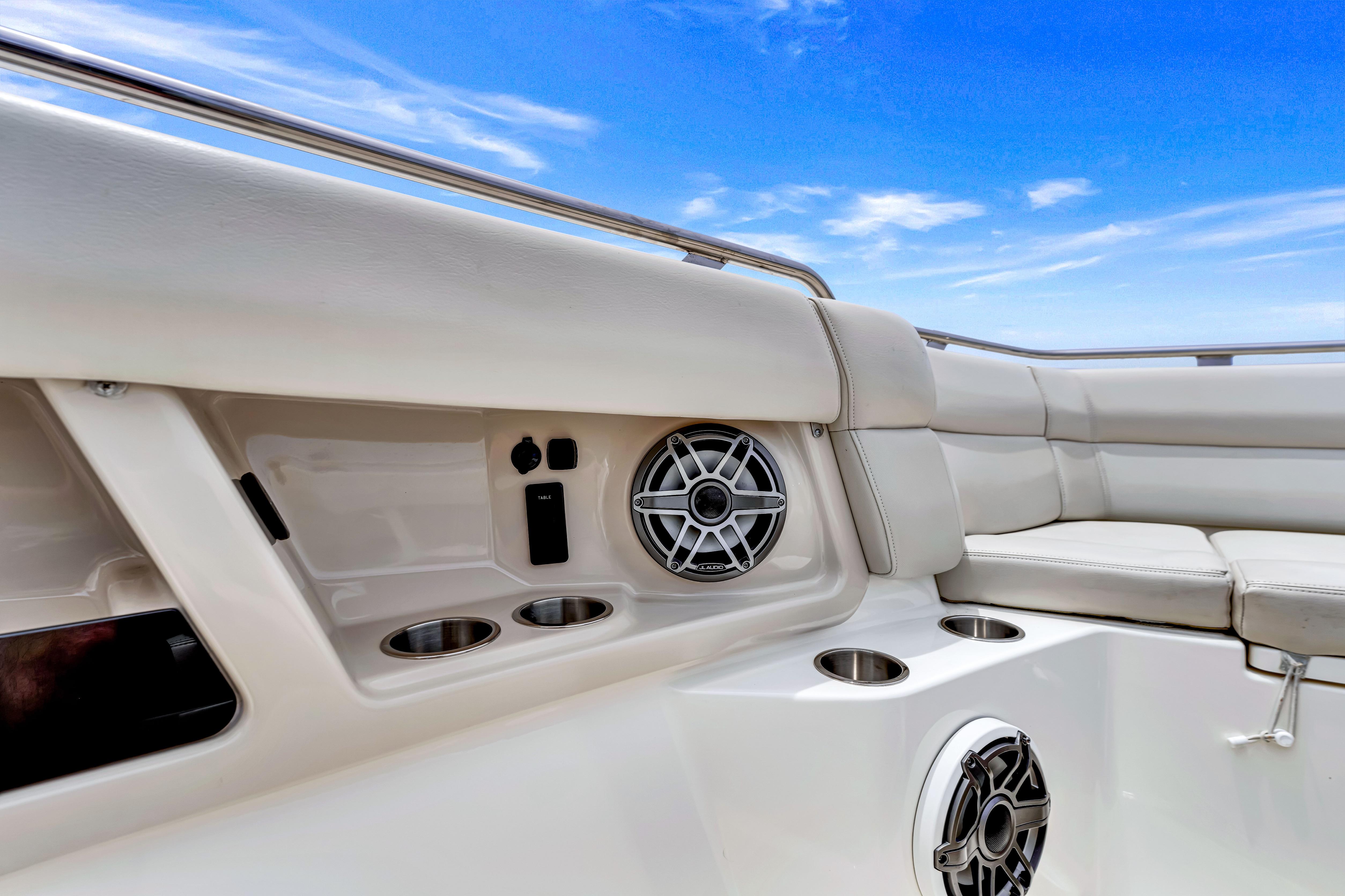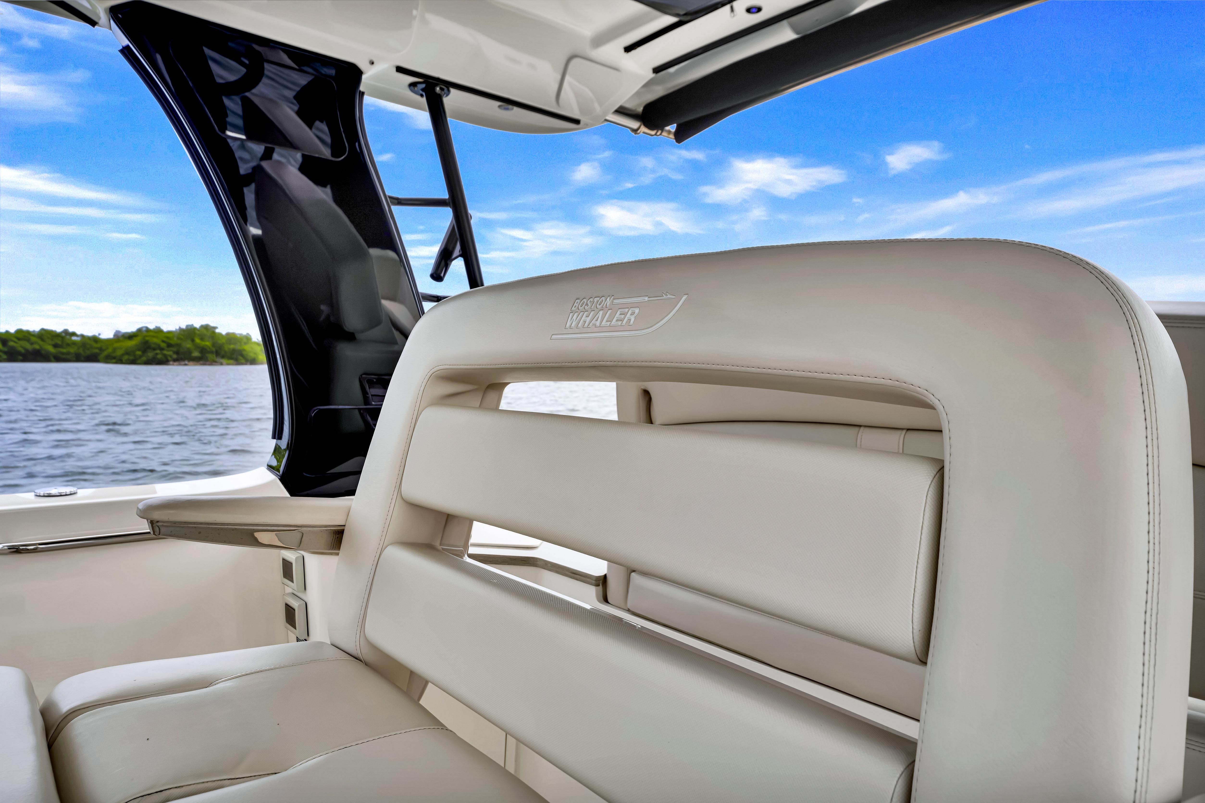 Robust forward console lounge includes fold-down armrests and drink holders, with forward island deck seating opposite.