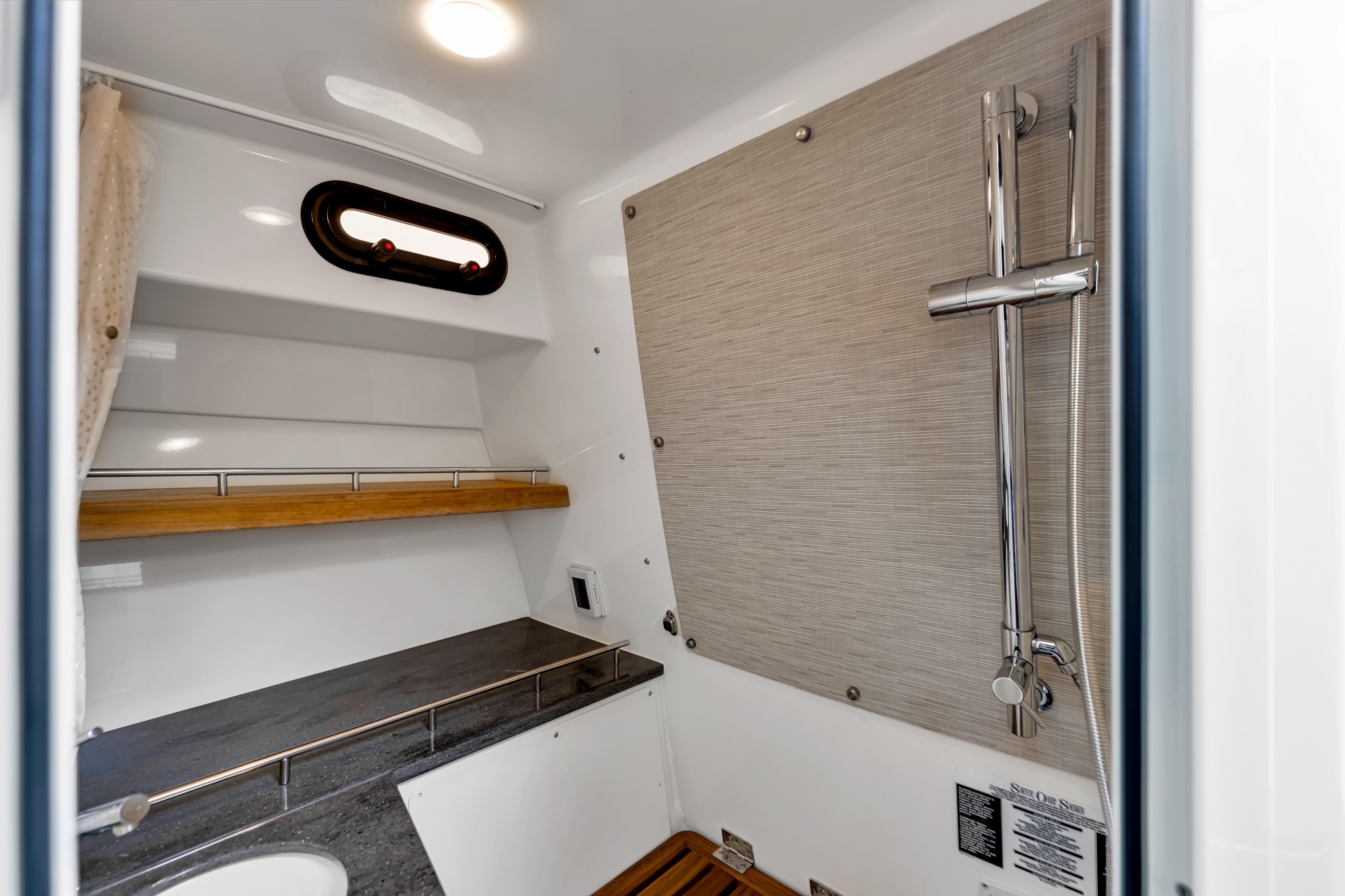 Inviting cabin includes convertible V-berth/seating area and well-equipped head for comfort