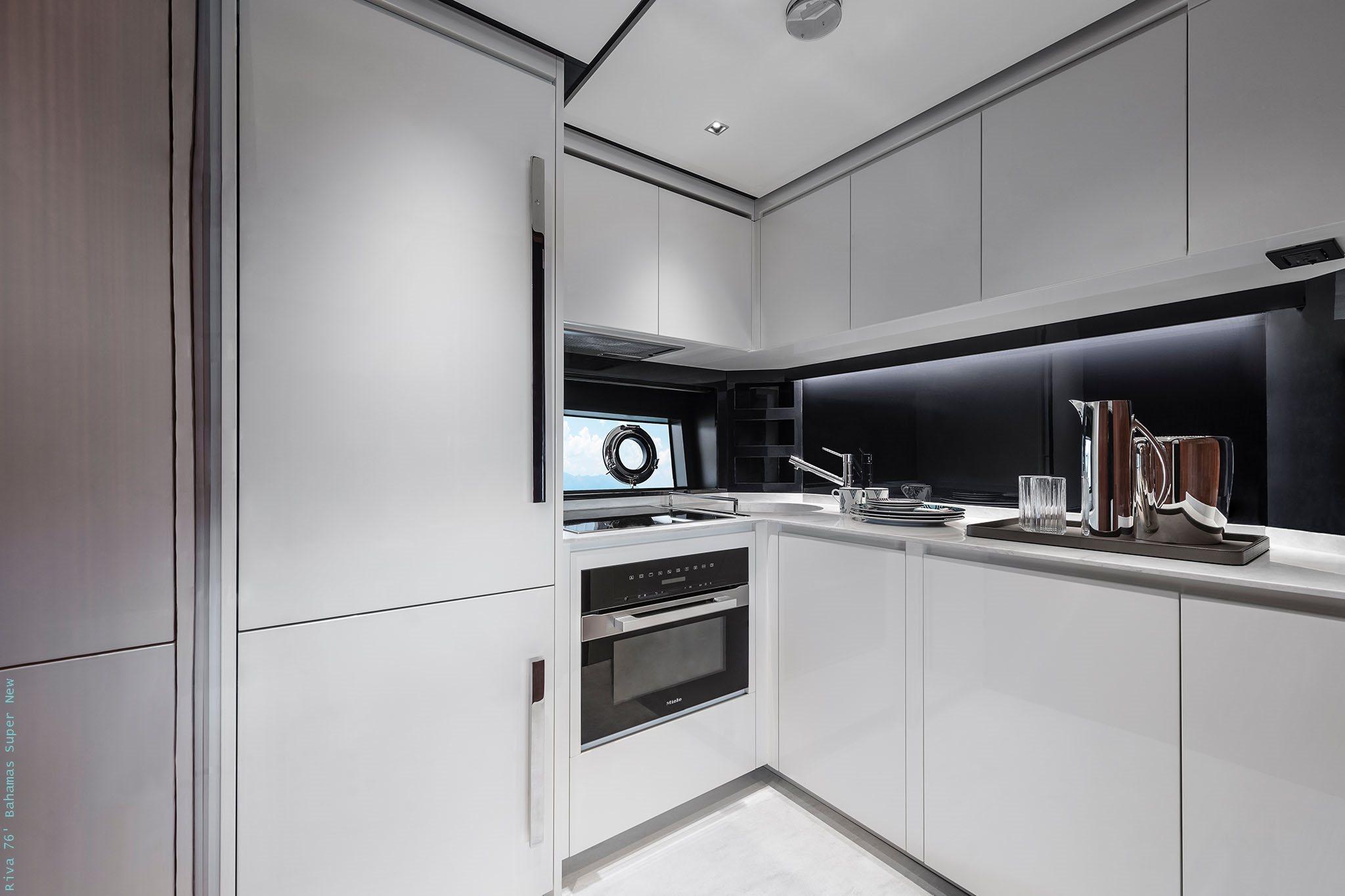Inside, the layout includes three luxurious en-suite cabins, including a full-beam master suite, along with a separate crew cabin. The lower deck features a bright and contemporary salon with a fully equipped galley, finished in premium materials like polished wood, stainless steel, and leather—hallmarks of Riva craftsmanship.