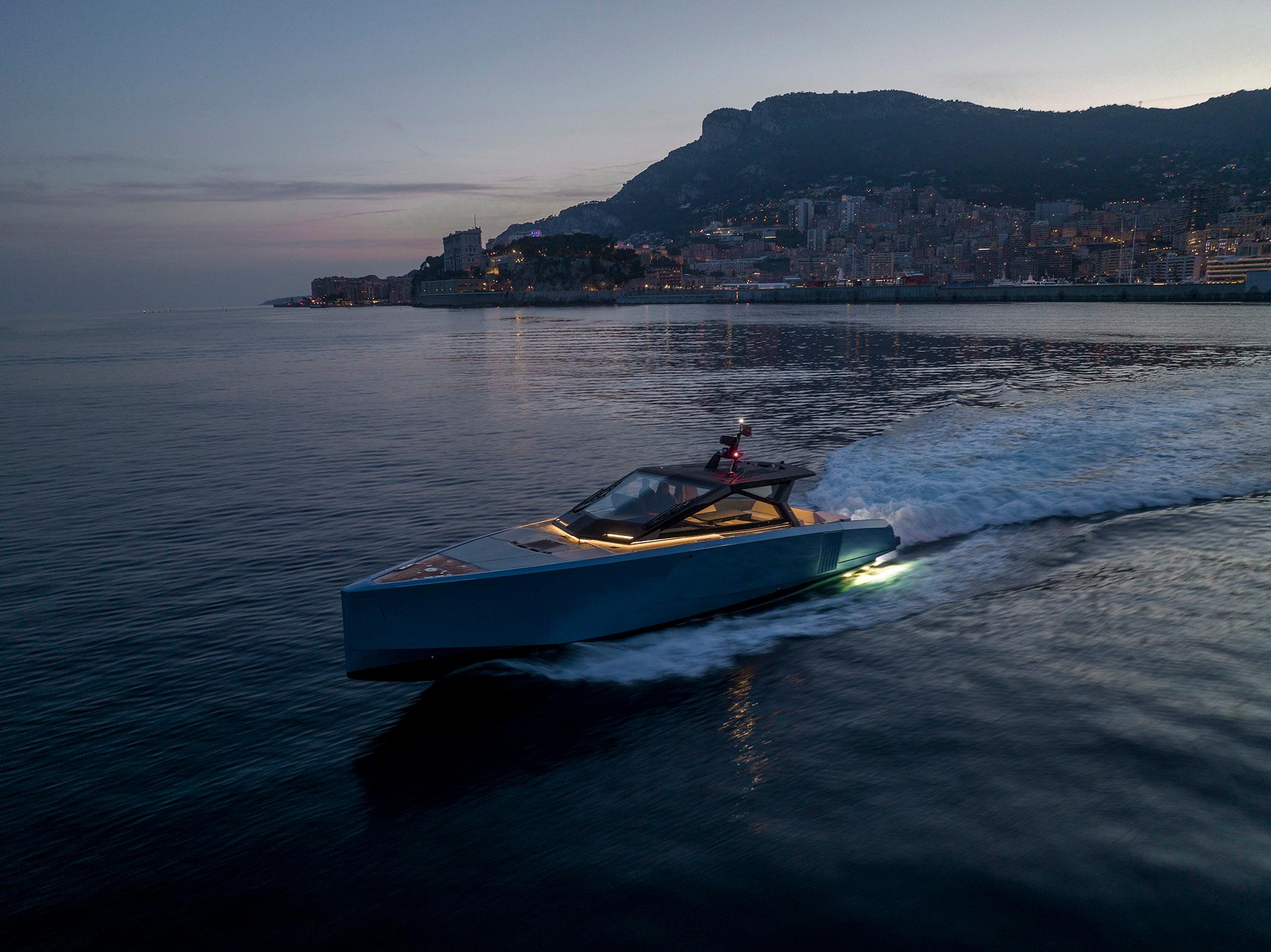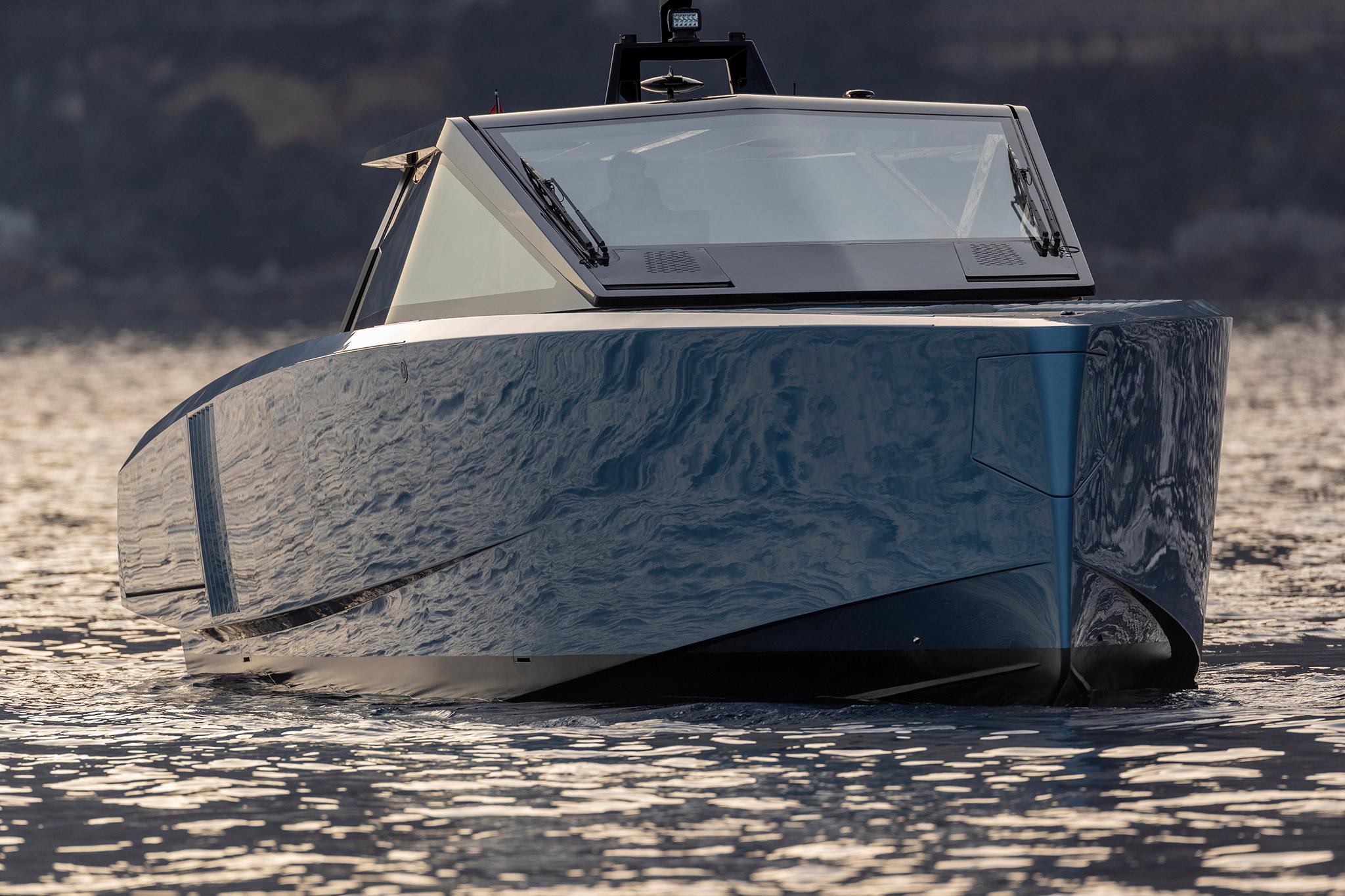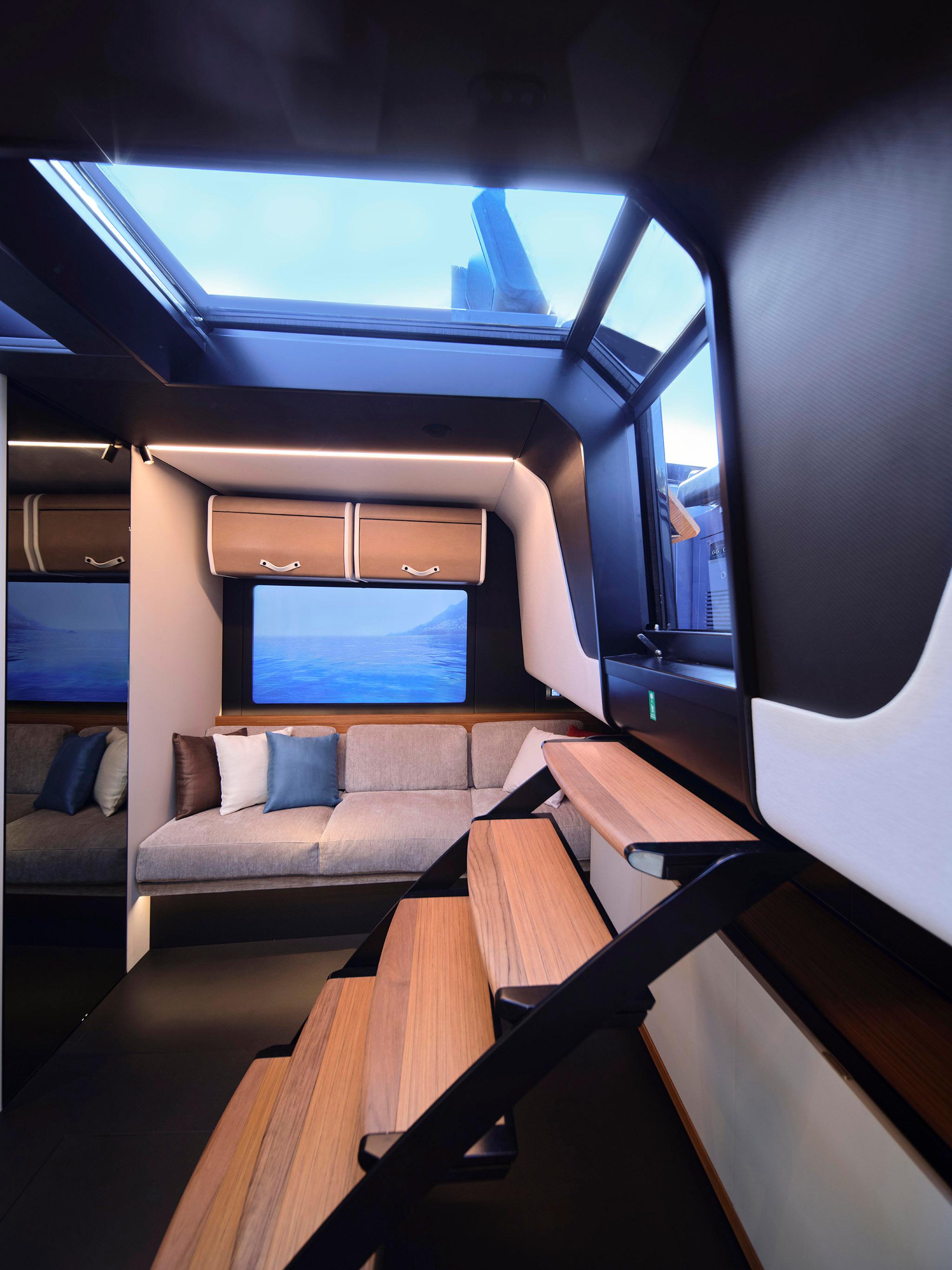 Wrap-around glazing complements the angular sweep of the windscreen and envelops a large cockpit. This offers the room for an elegant polygonal dining table and a deep sofa. Cabinets on both sides can be filled with the owner’s choice of fridges, cooktops, and storage to create a flexible galley.