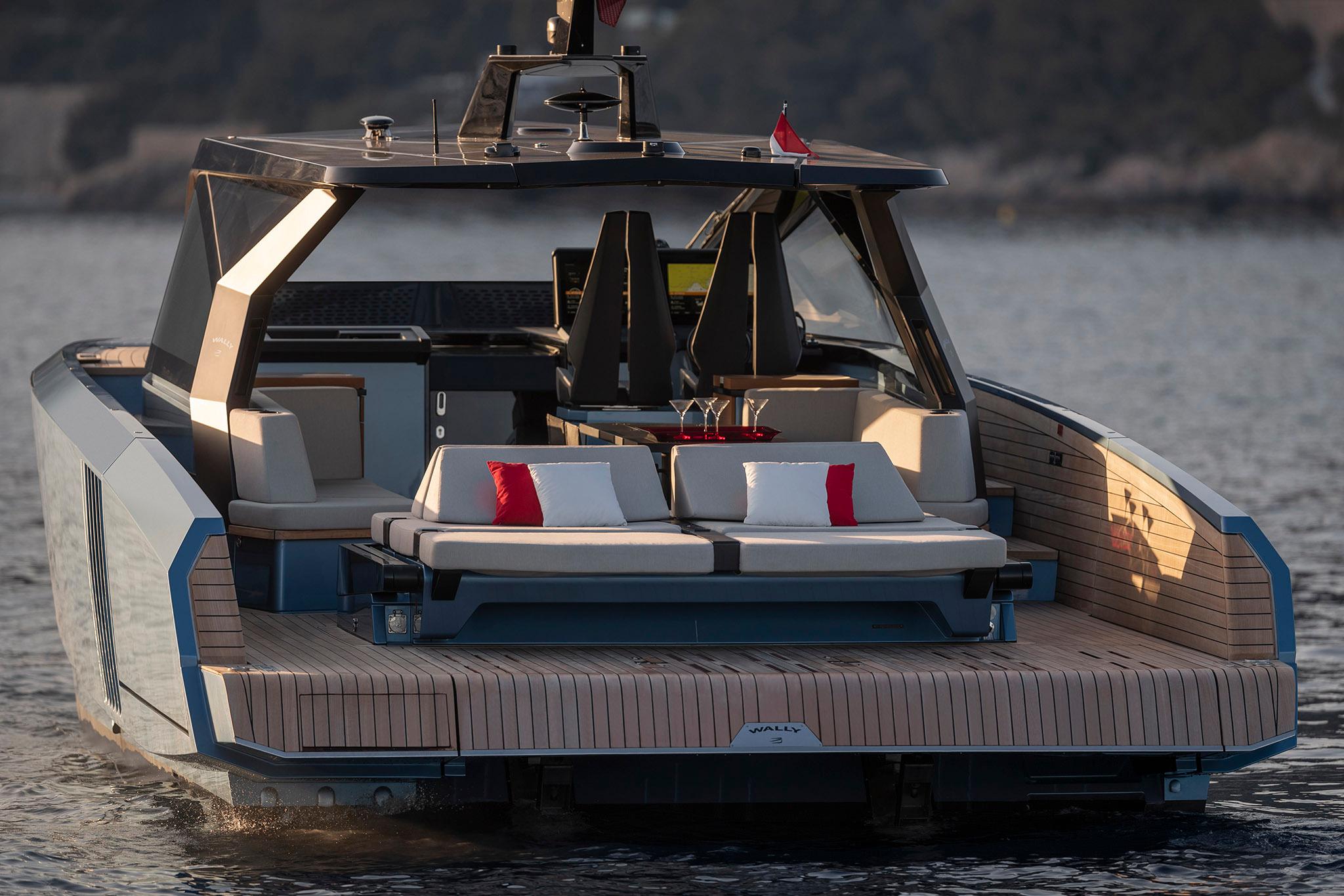 A large sunpad dominates the aft deck, with its signature fold-down wings. In a unique twist, Wally has developed a striking electrical awning that swings up out of the deck like the roof of a soft-top car. A convertible passerelle-bathing ladder is hidden in the stern, and the aft platform lowers into the water at the touch of a button to launch/retrieve the tender and water toys.