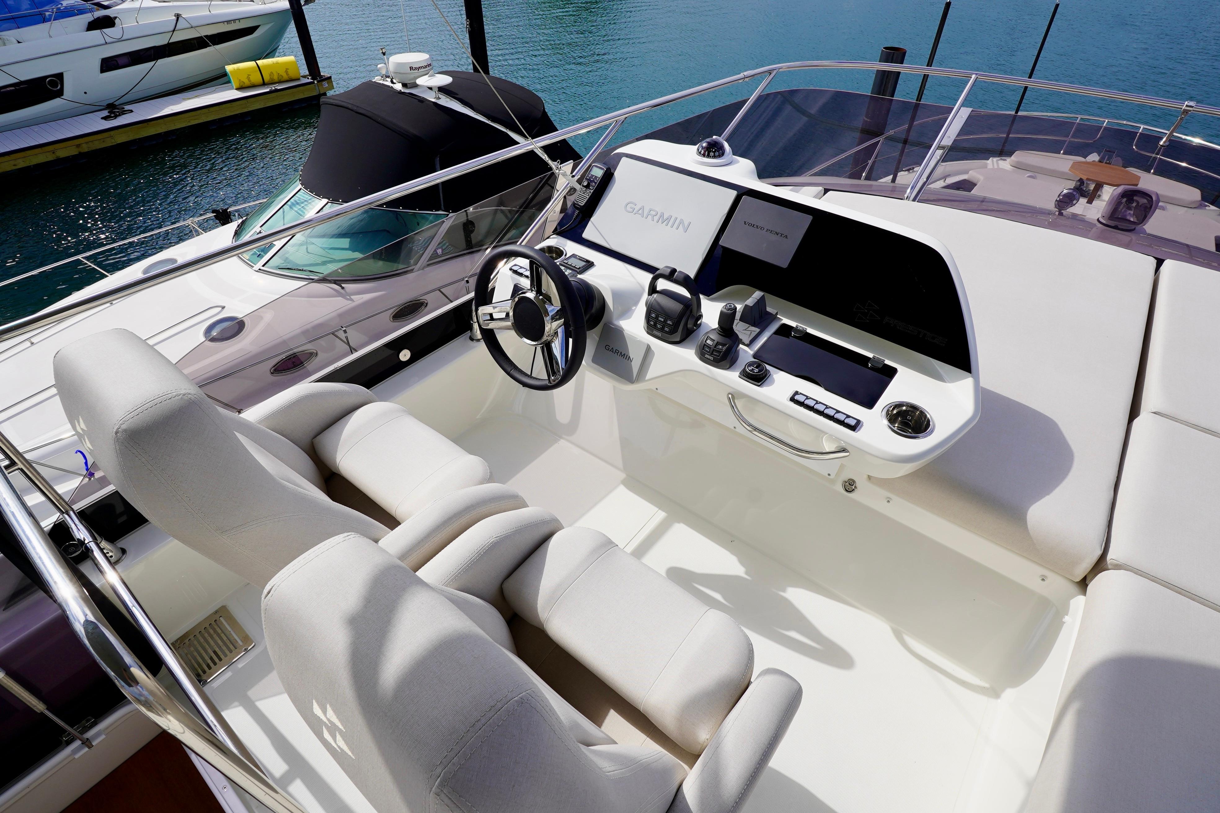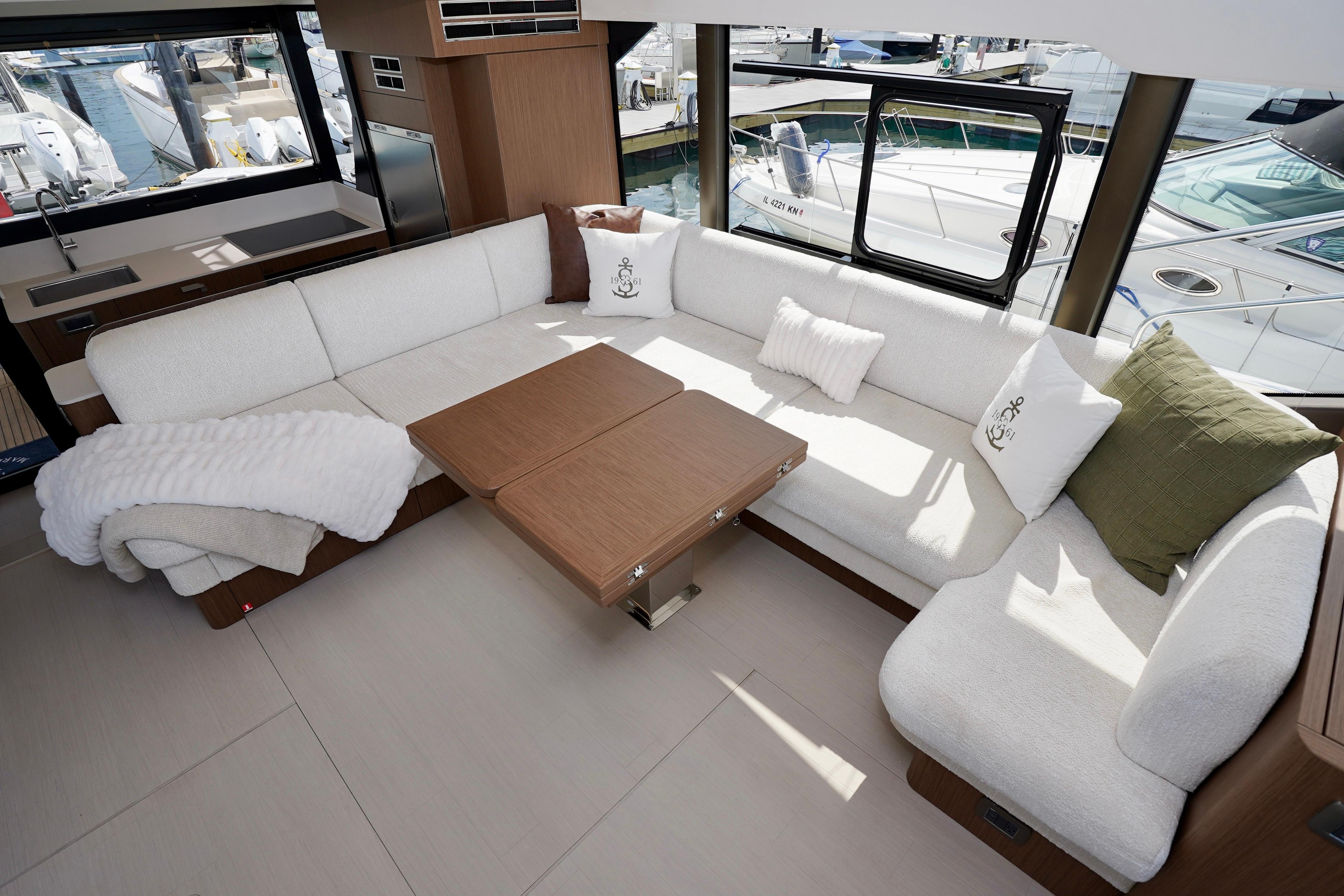 Sheltered by a hard top, the flybridge offers a true terrace overlooking the ocean: the ideal spot to savor precious moments together while taking in the panoramic view. Just next to the helm station and its two comfortable armchairs, generous sundecks invite relaxation. The spacious exterior saloon and dining table are perfect for special moments with friends, with the sea extending across the horizon.