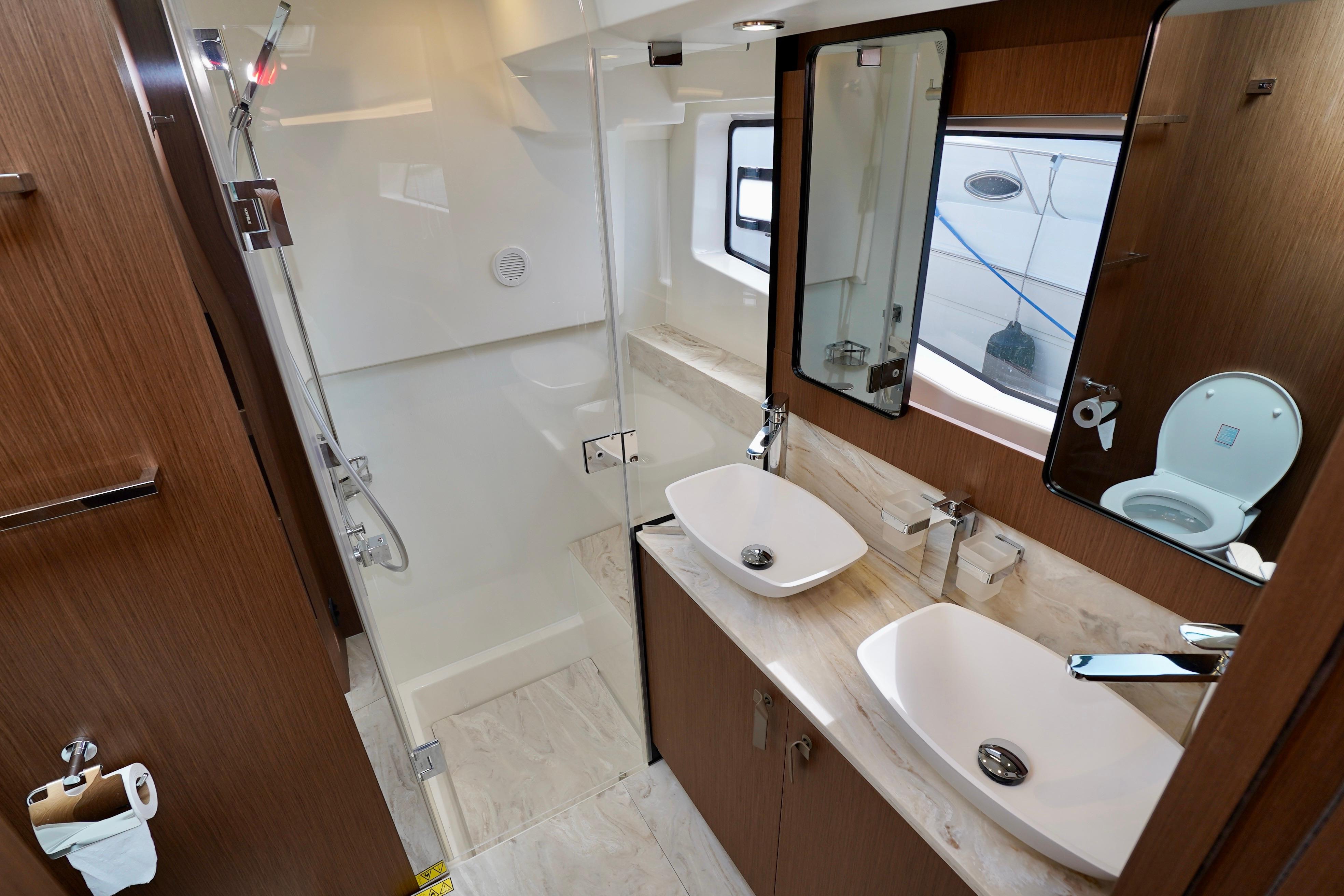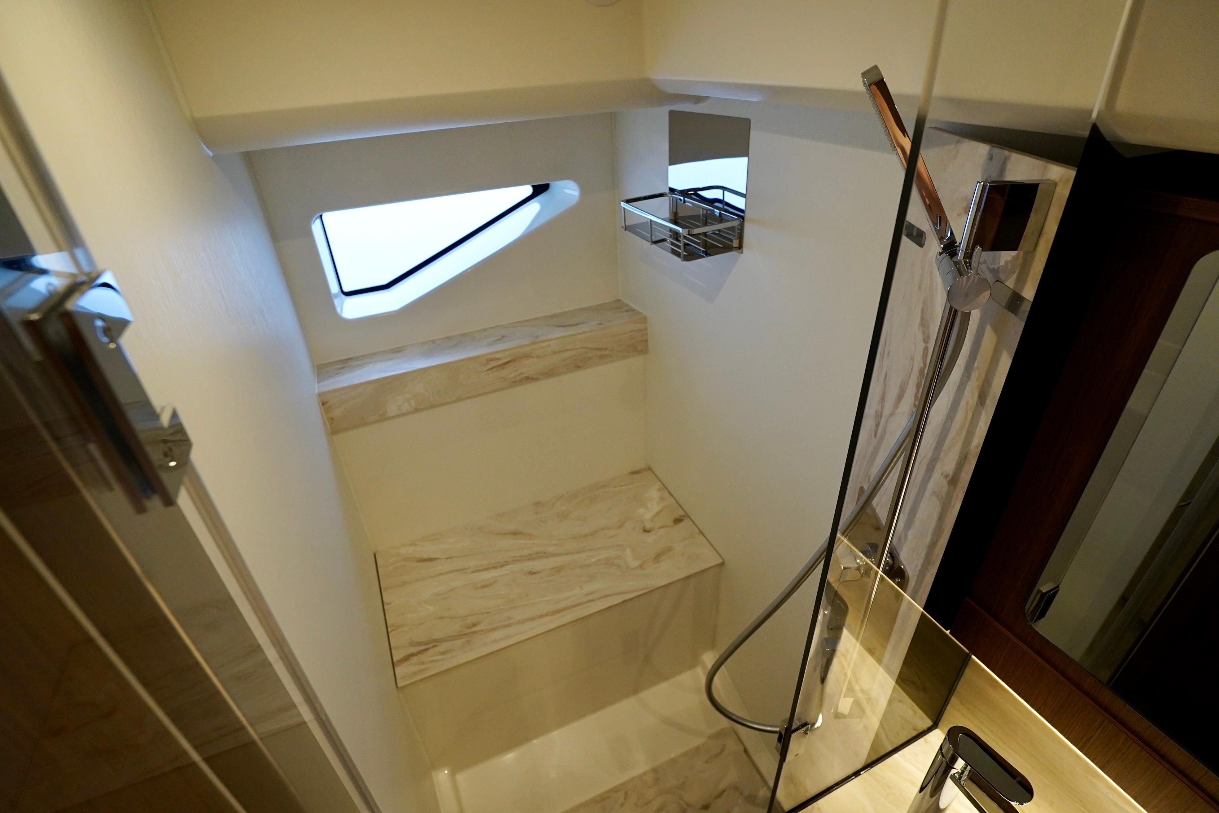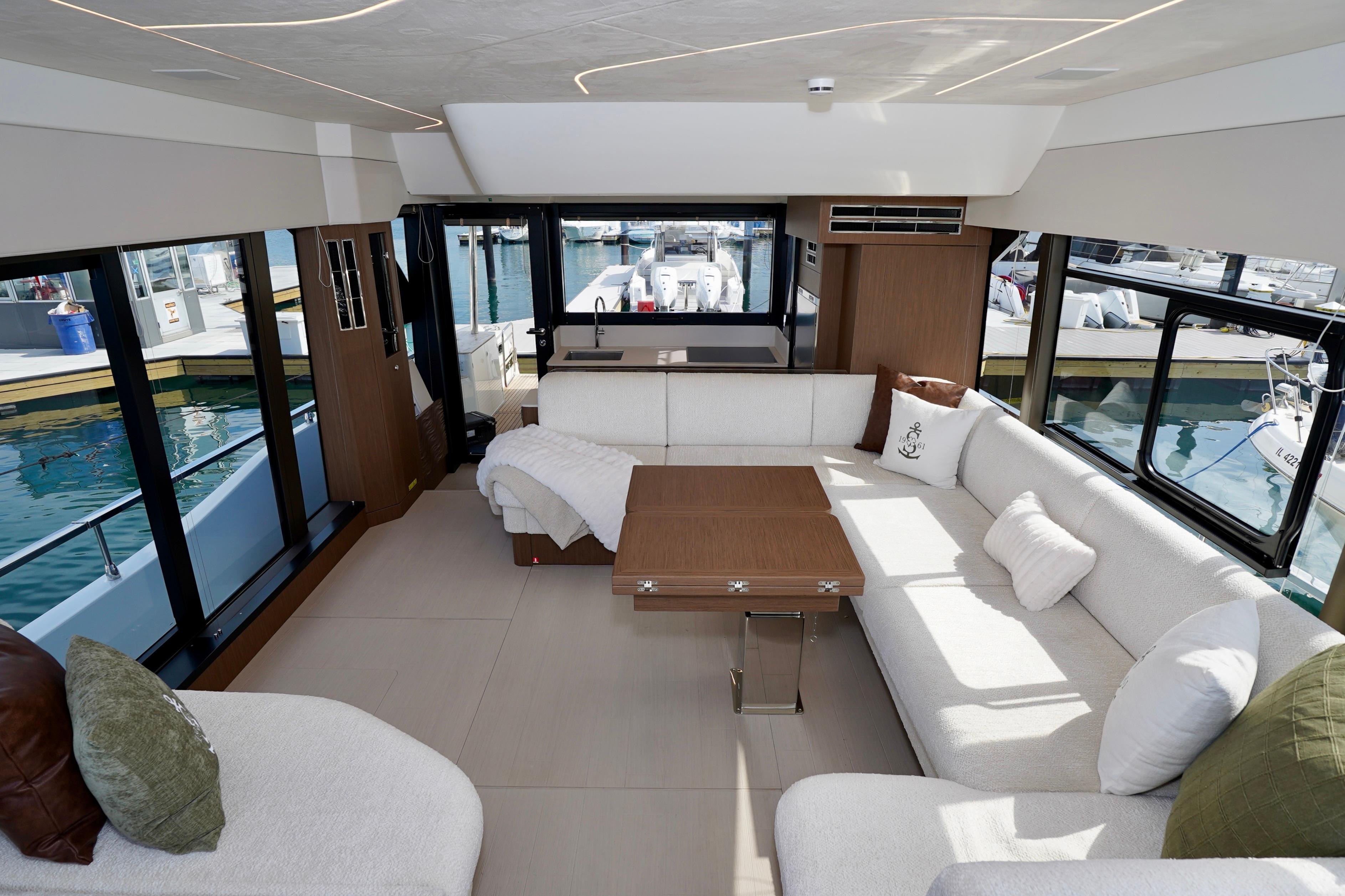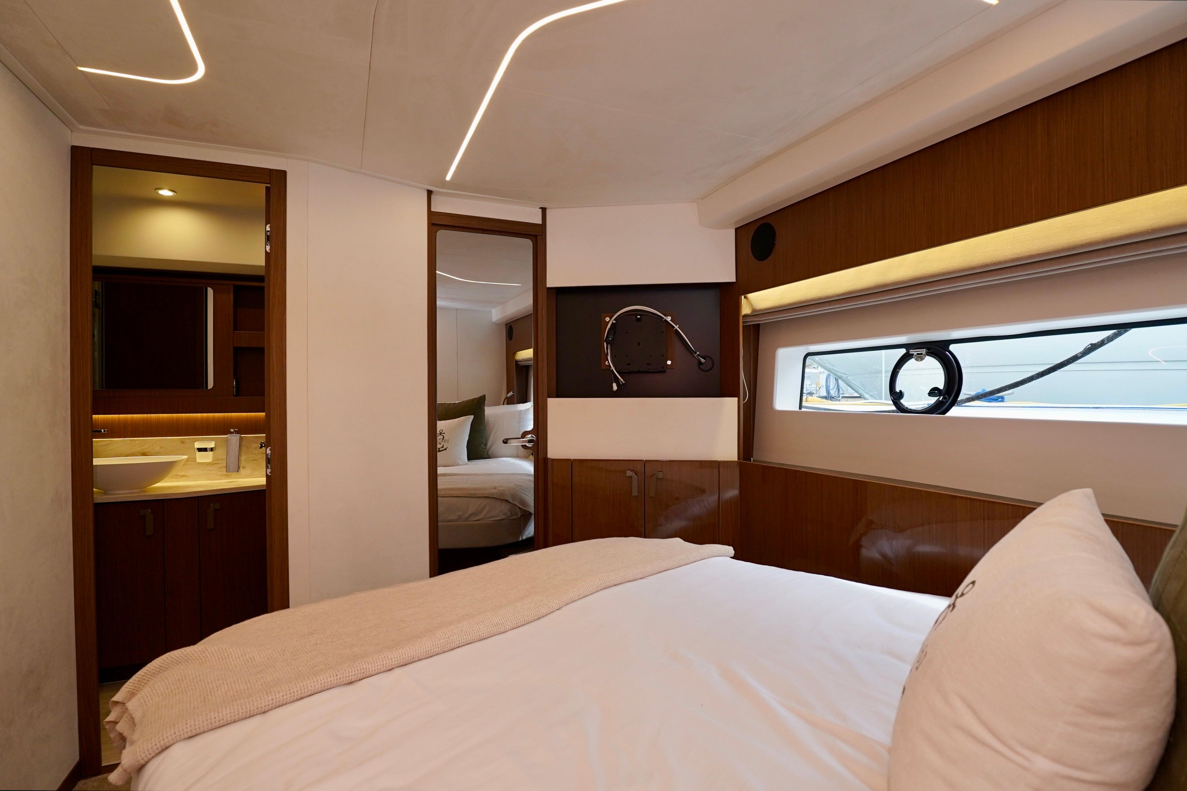 Peacefully settled into the curve of a sumptuous C-shaped sofa, facing an immense sliding glass door, you sense a connection to the sea, omnipresent in the interior saloon, wherever you turn your gaze. The atmosphere is warm and soothing. The design, superior fit and finish, and lighting contribute to the magic of your evenings at anchor, facing dream landscapes.