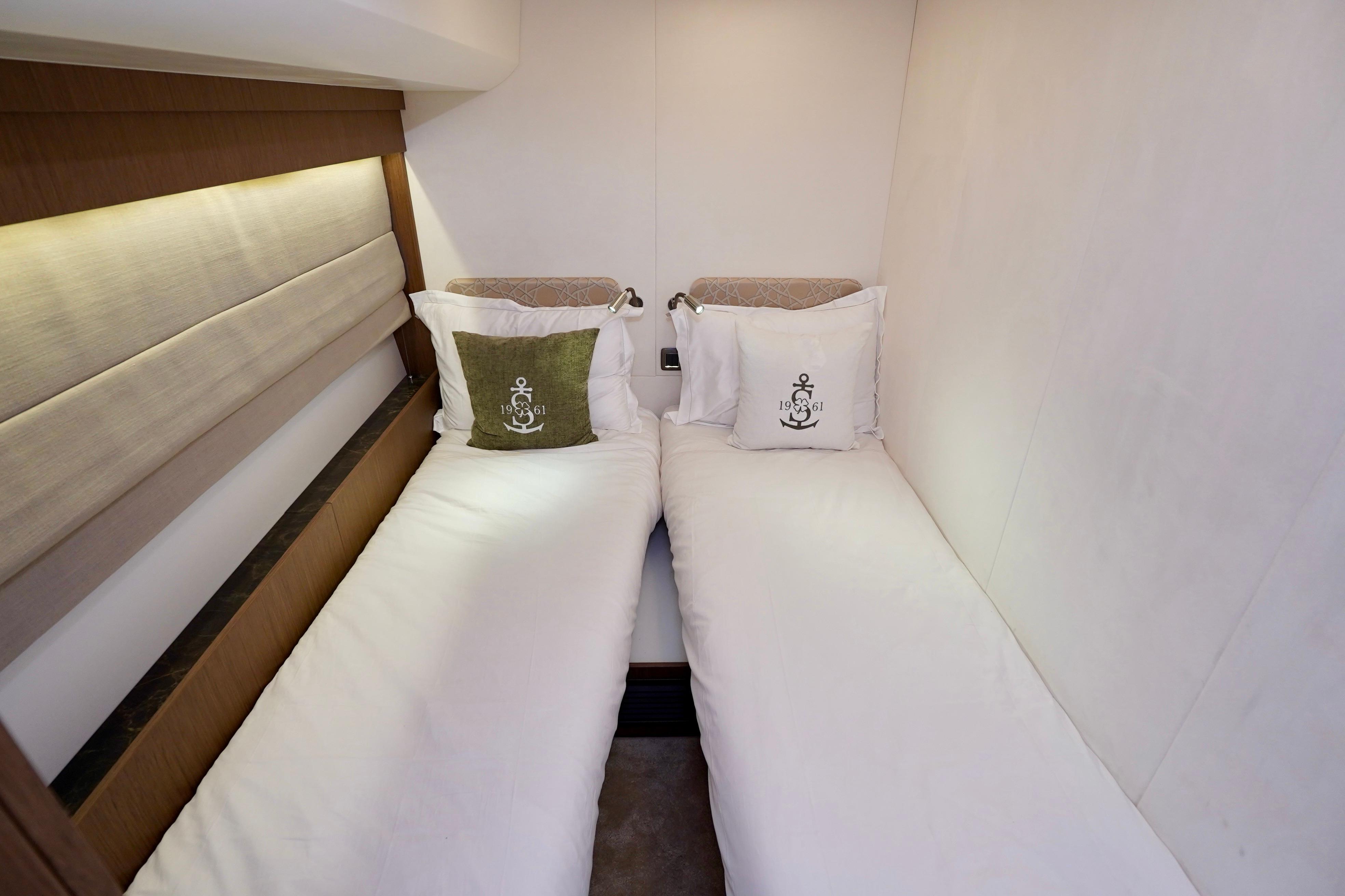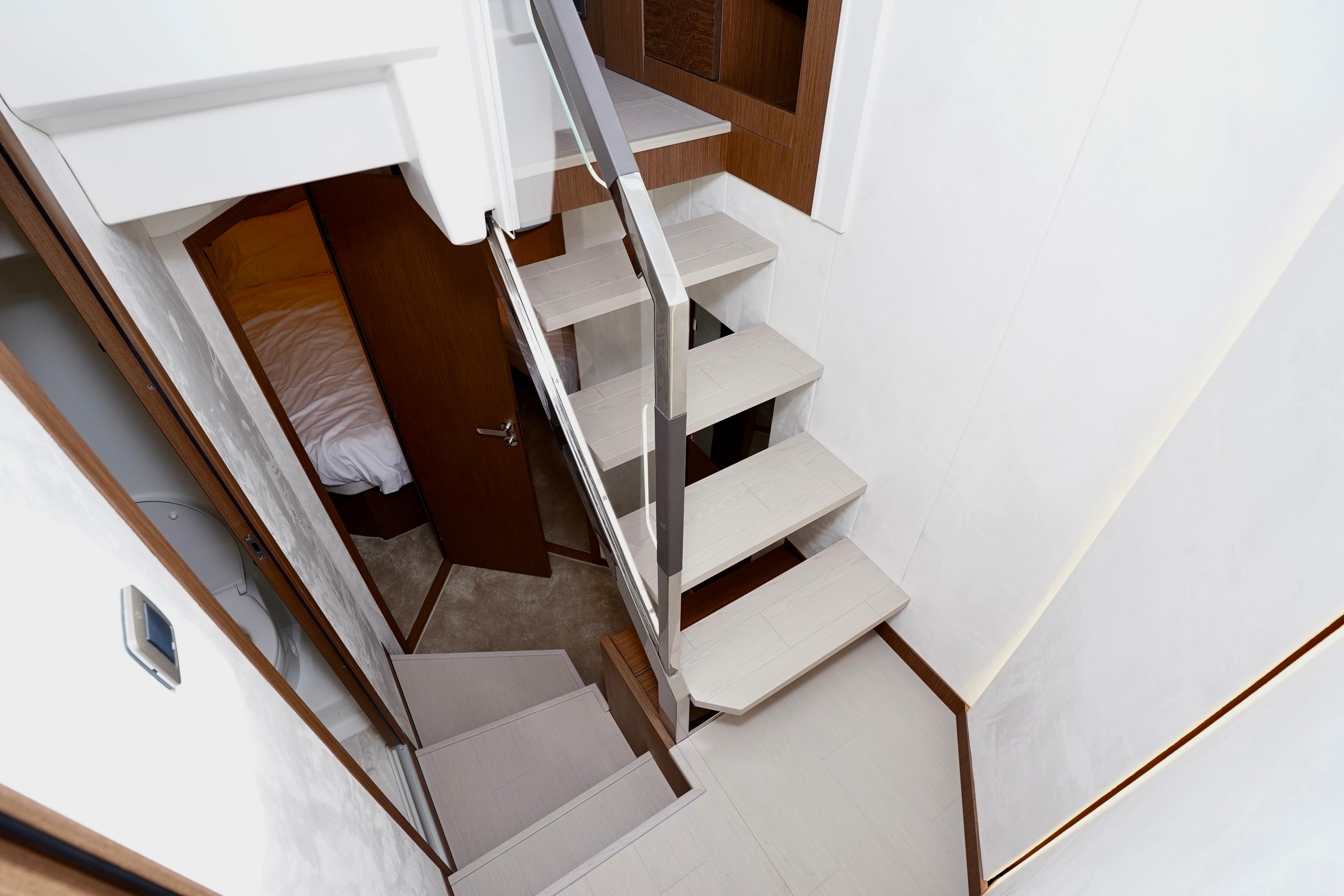 The owner's suite, cleverly situated forward in a semi-main deck arrangement, provides a quiet, peaceful, intimate living space for the owner, conducive to reflection, or simply rest.