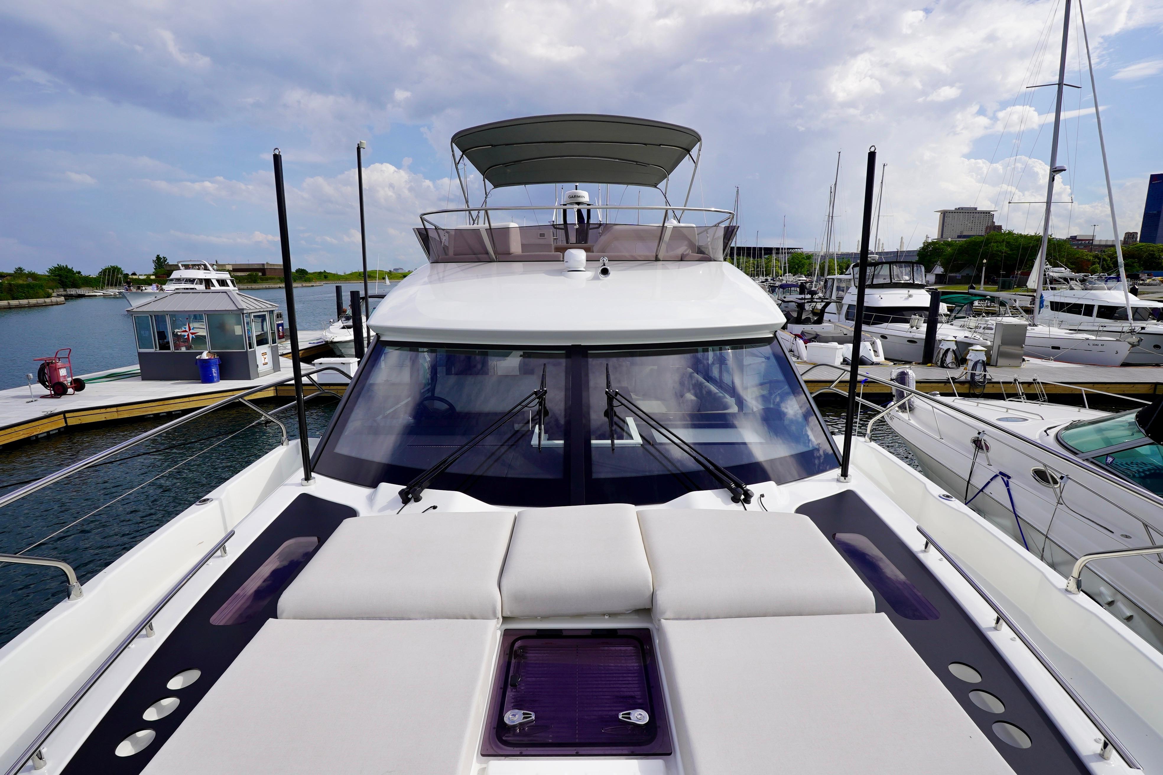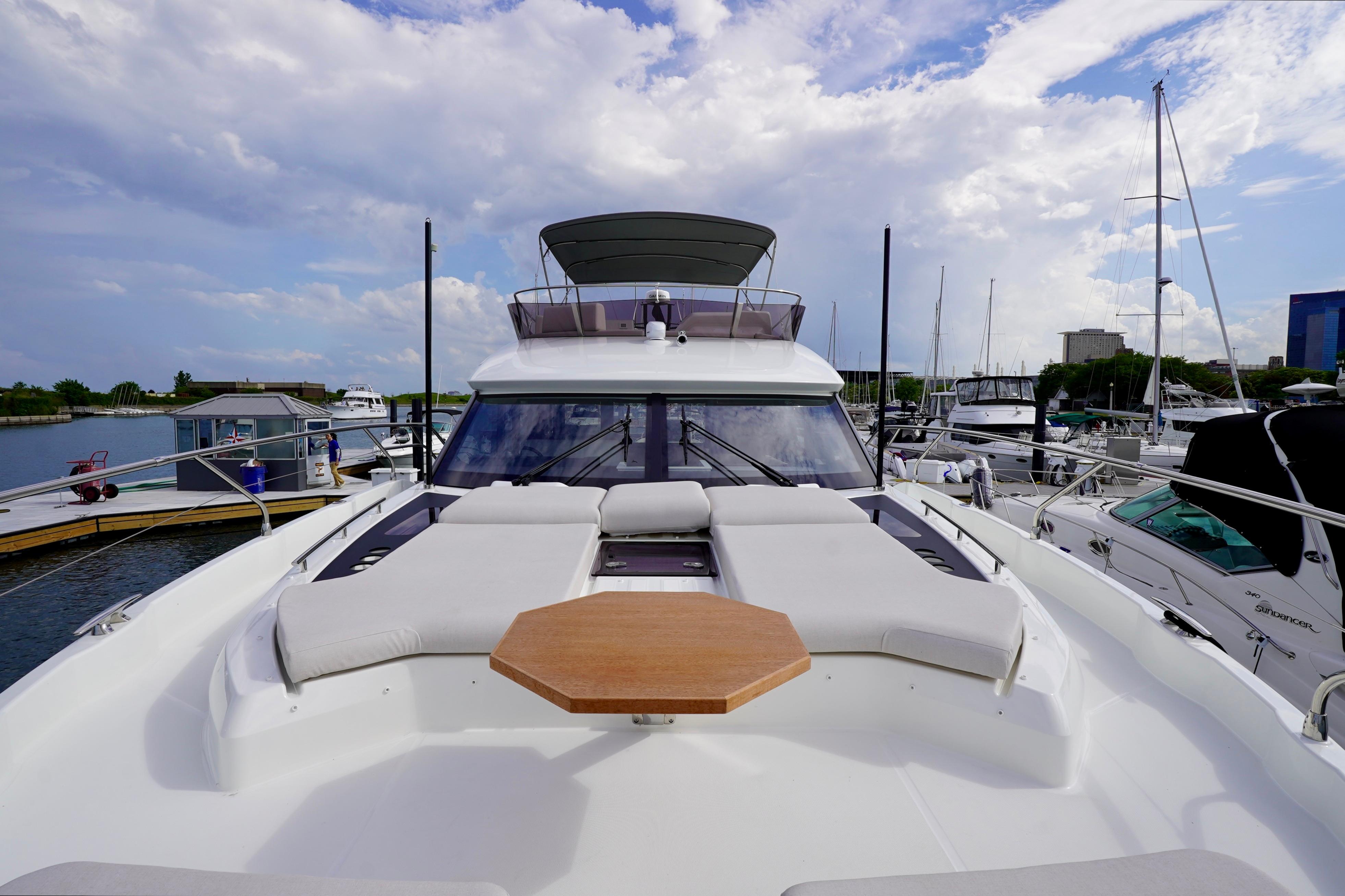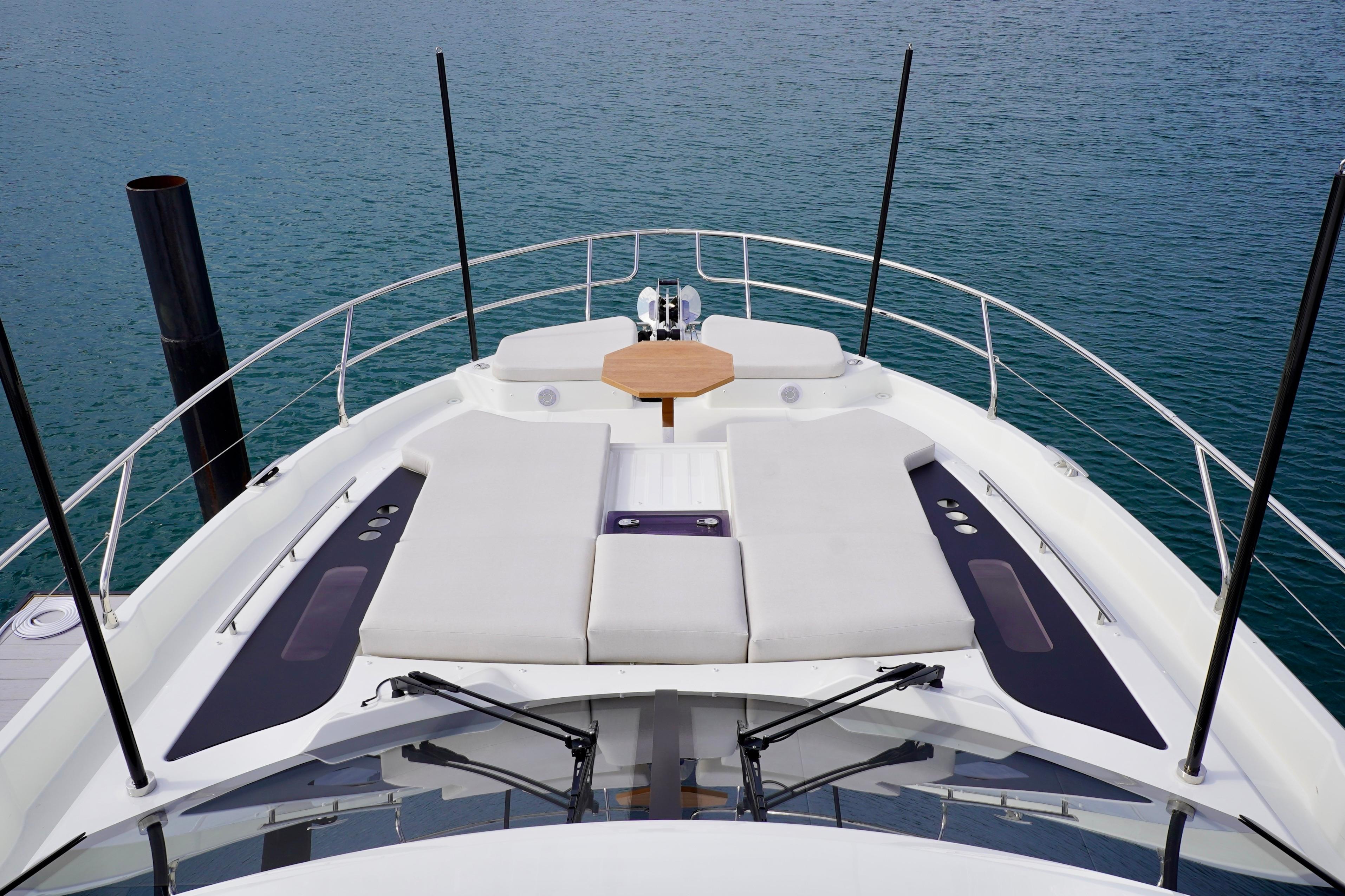 Featuring a semi-circular bench seat, a vast, comfortable sunpad with an adjustable back rest, and a modular coffee table, the forward deck of the F5.7 transforms into a superb lounge. This is the ideal place to take full advantage of the sea, to spend time with friends or to simply relax, read, dream, and escape the everyday, where time stands still.