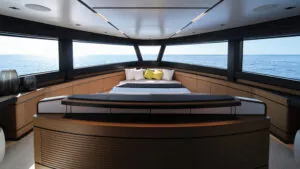 In keeping with a design philosophy that aims, on the one hand, to combine form and function through distinctive and highly recognizable aesthetic and, on the other, to guarantee a new and immersive yachting experience with the element of water, wallywhy200 features a spectacular 4.7-meter-high glazed bow housing a stunning 37 m2 master suite overlooking the sea, with an uninterrupted 270-degree view of the horizon. This cabin stands out also for its exceptional noise levels thanks to the positioning of the engine room which is located at the opposite end of the yacht.