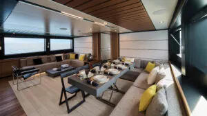 Thanks to the 5G wireless network connection with home automation control, guests are able to comfortably manage all the audio/video systems via mobile devices, both outside and inside the yacht. Through Naviop’s integrated system, they will also be able to check navigation data, keeping the yacht’s progress and parameters constantly under control. The first unit features a state-of-the-art 55 inch TV in the upper living room and a 5.1 Premium sound system on the main and upper decks, while a sophisticated Sonance sound system serves the outdoor areas.
